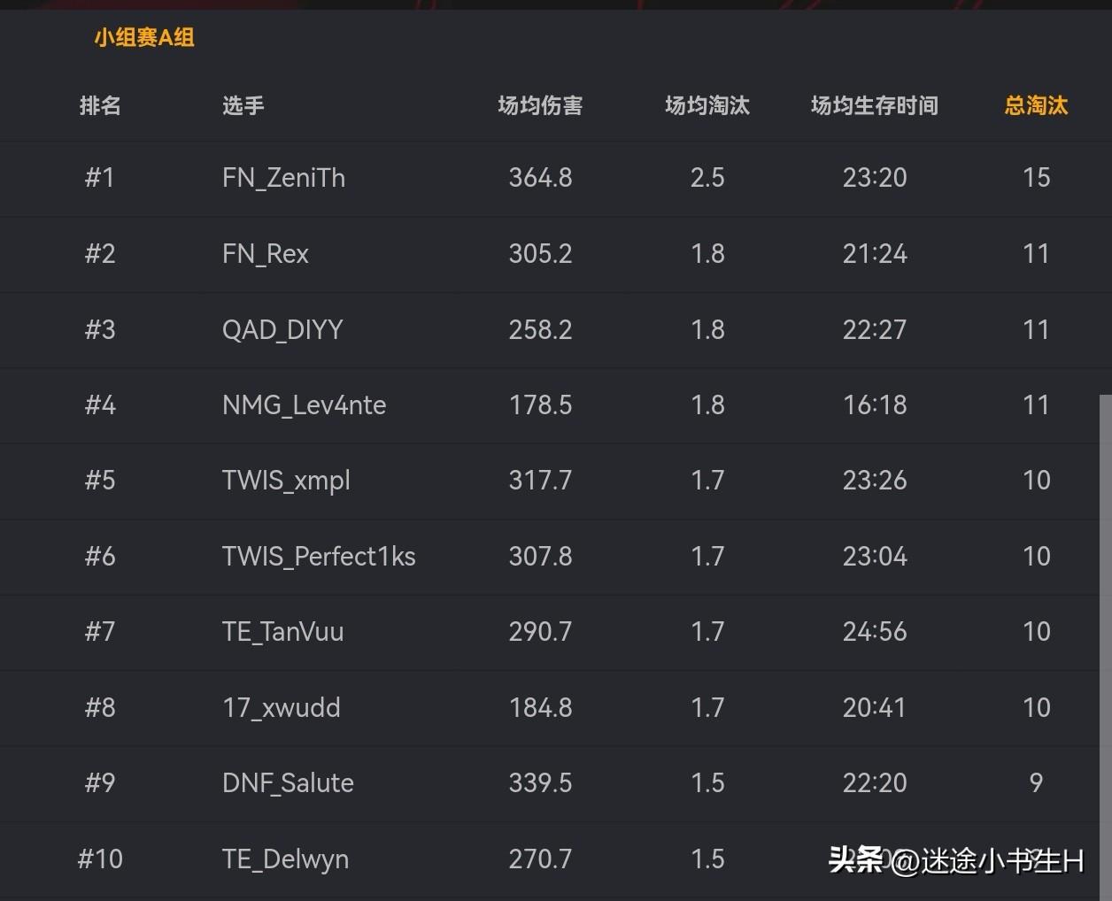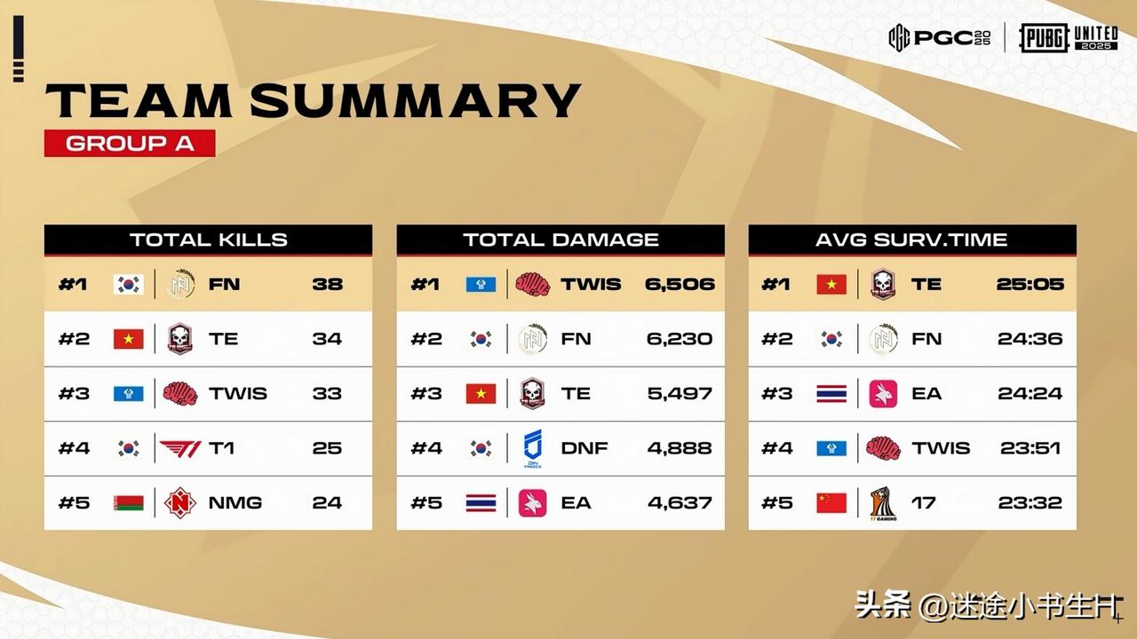 真打不过啊! PGC全球总决赛A组小组赛首日比赛结束! FN第一、TE第二、TWIS第三、SP第四 17第十一、4AM和JDG暂时进入淘汰名单! 17感觉只有小伍在线,个人单日10个淘汰拖着队伍负重前行,但这么玩也撑不了多久 4AM算是开了个好头,还有一把吃鸡的表现,后面就是经典的高开低走,最终只有23分,小鹿6个淘汰、shen、LZ都是3个,枪手阿童木单日0个淘汰,这火力输出太弱了,与T1的roll点也是输了 JDG与4AM同分都是23分,作为联赛冠军,JDG能打成这样真是挺意外的,双子星感觉到了国际赛场完全哑火了!