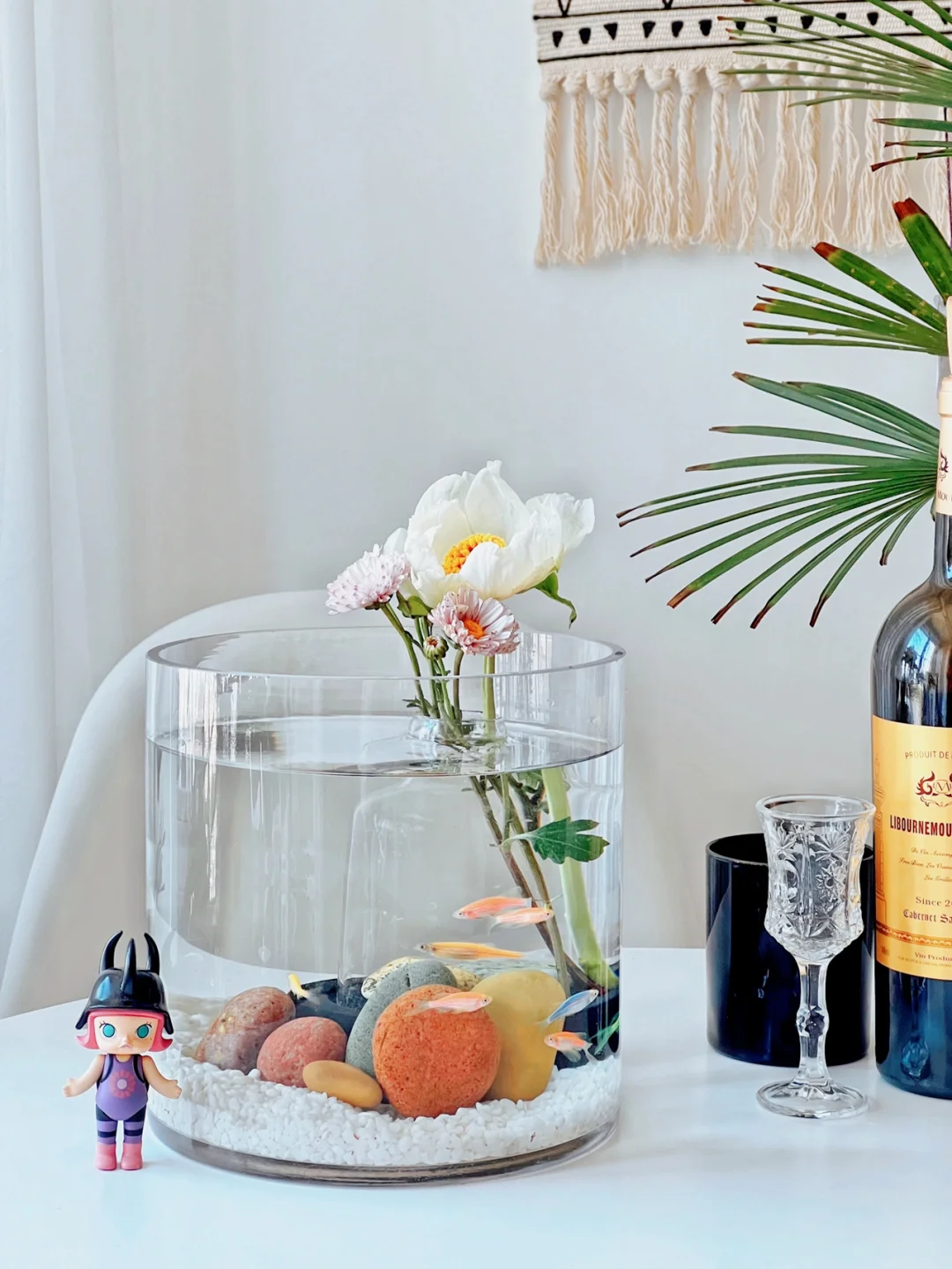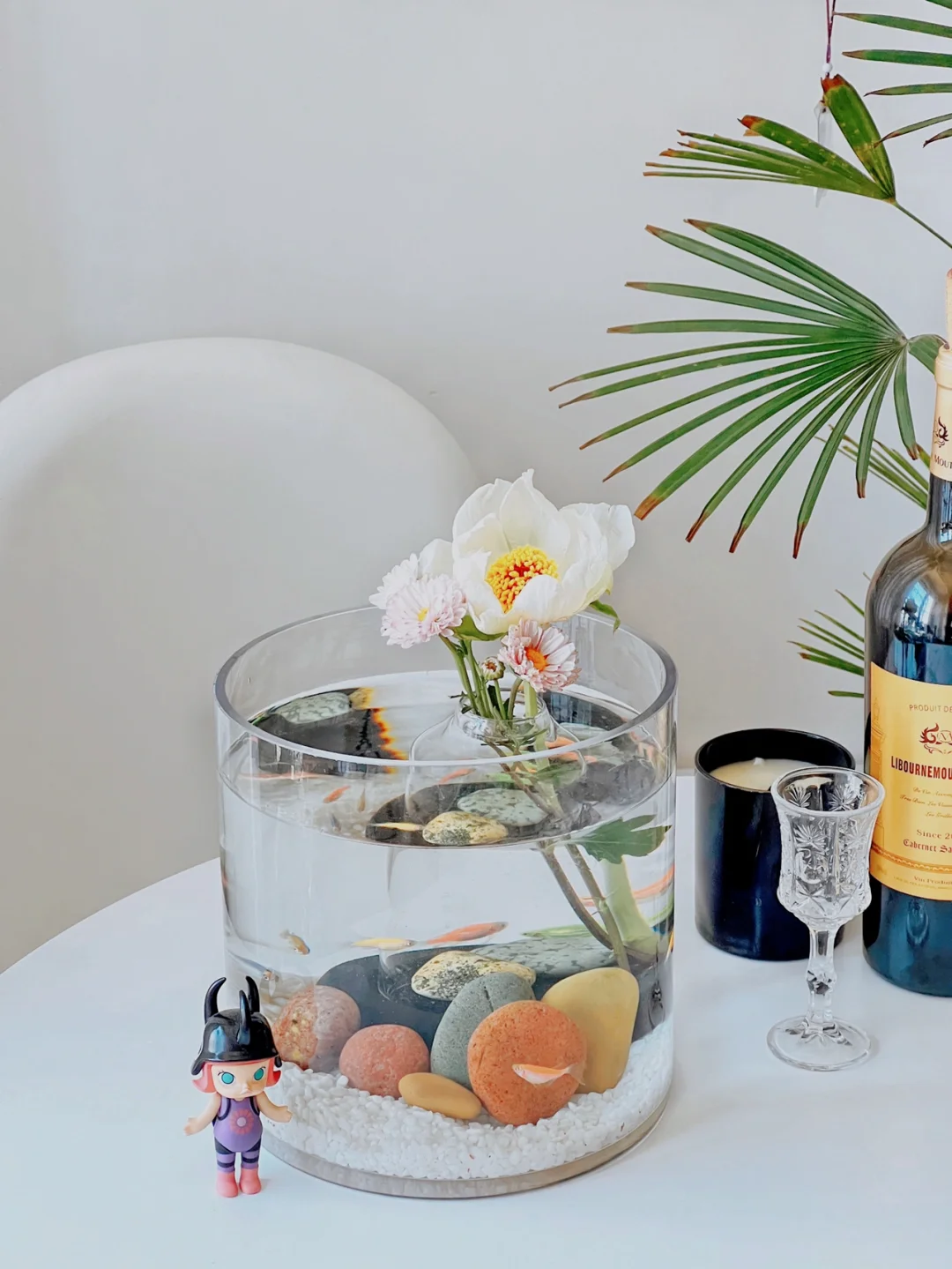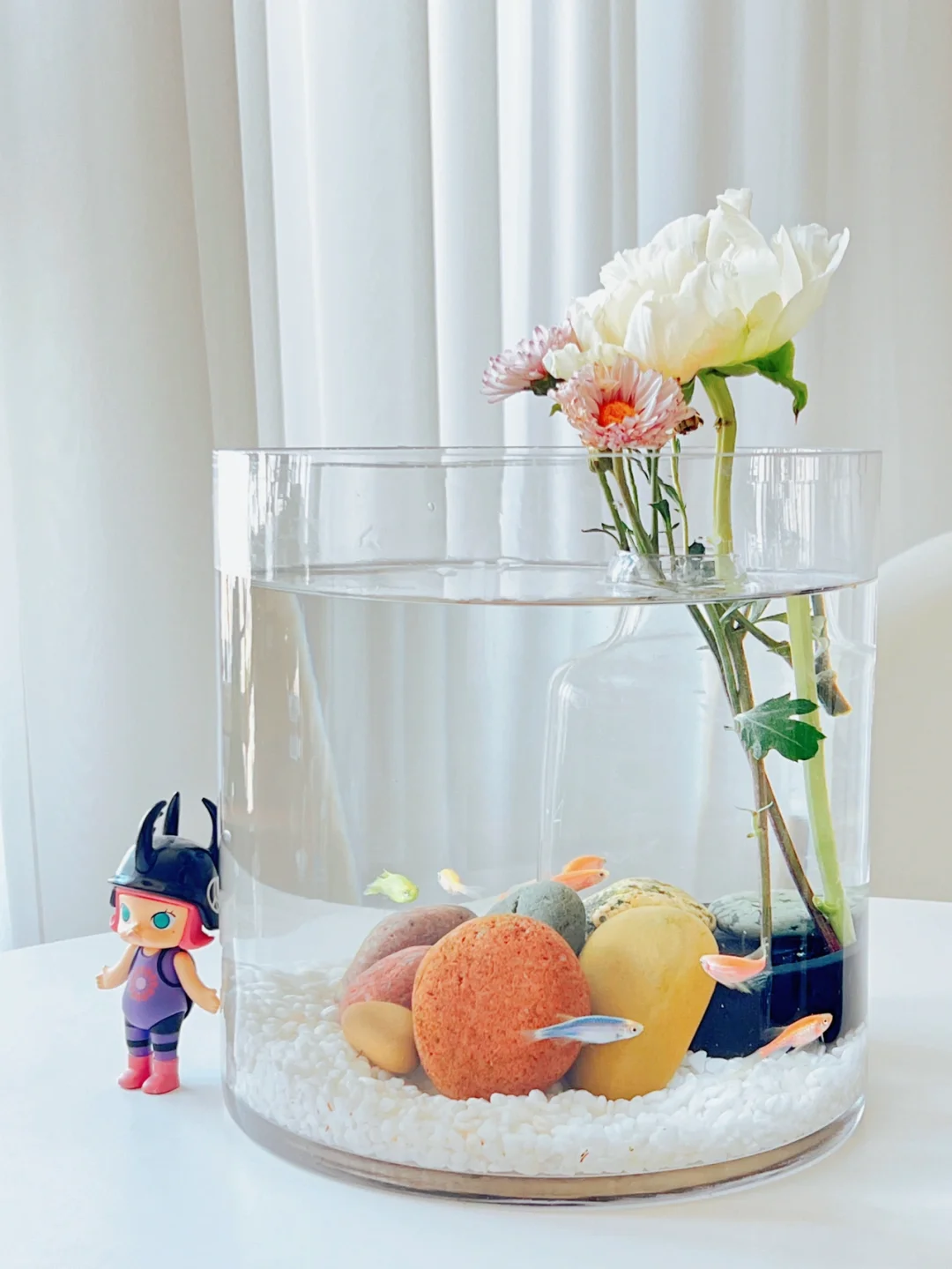 “水中花”这个鱼缸造景其实很简单。我在鱼缸底部放了一个玻璃瓶,瓶里要放两块石头压着,否则会漂浮。插了两只雏菊和芍药,花朵从瓶口绽放向上探出鱼缸,宛如飘在水中央,亭亭玉立。搭配鱼缸底部的长江五彩石,很有韵味。