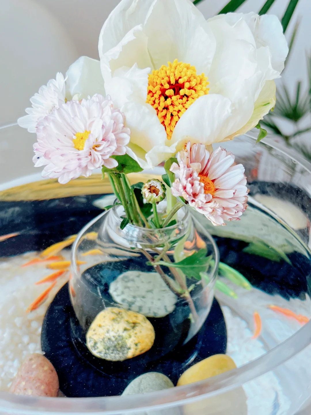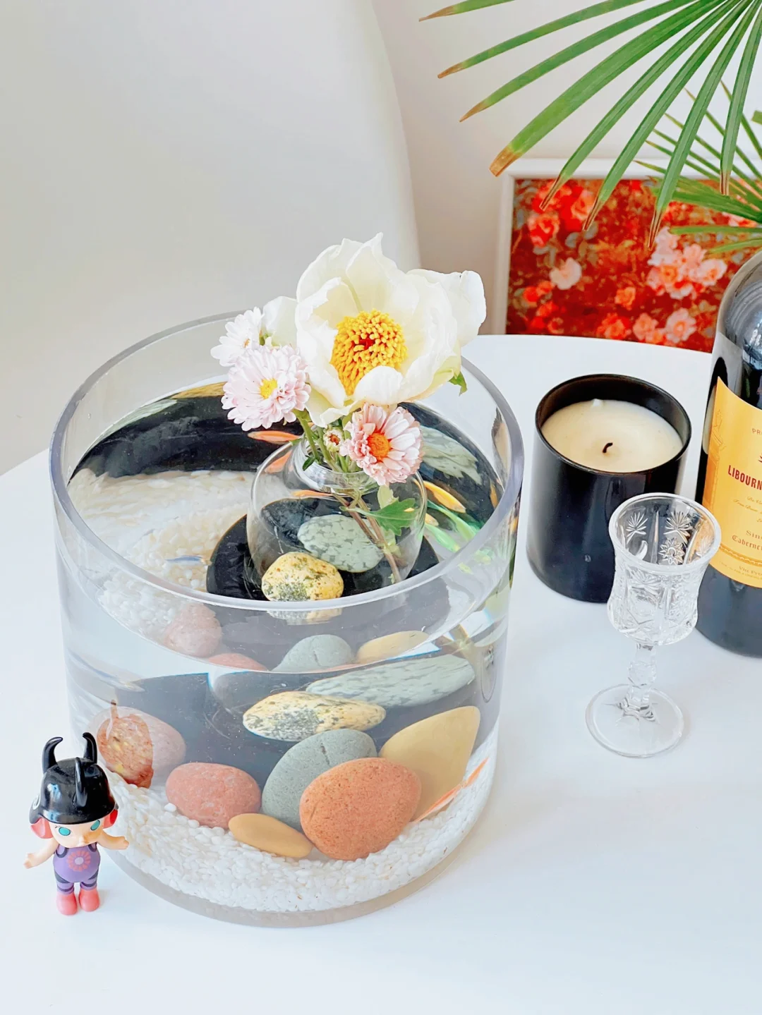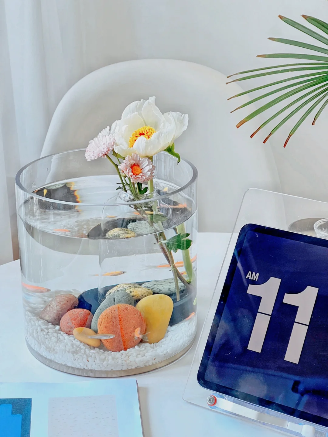 “水中花”这个鱼缸造景其实很简单。我在鱼缸底部放了一个玻璃瓶,瓶里要放两块石头压着,否则会漂浮。插了两只雏菊和芍药,花朵从瓶口绽放向上探出鱼缸,宛如飘在水中央,亭亭玉立。搭配鱼缸底部的长江五彩石,很有韵味。