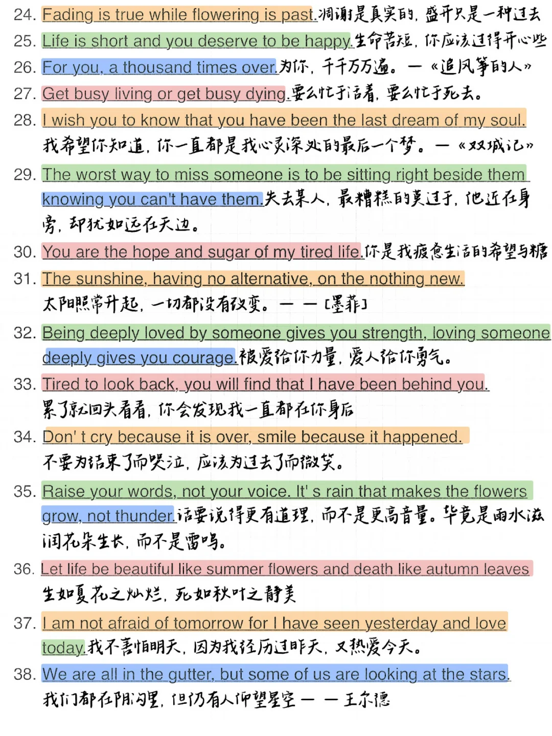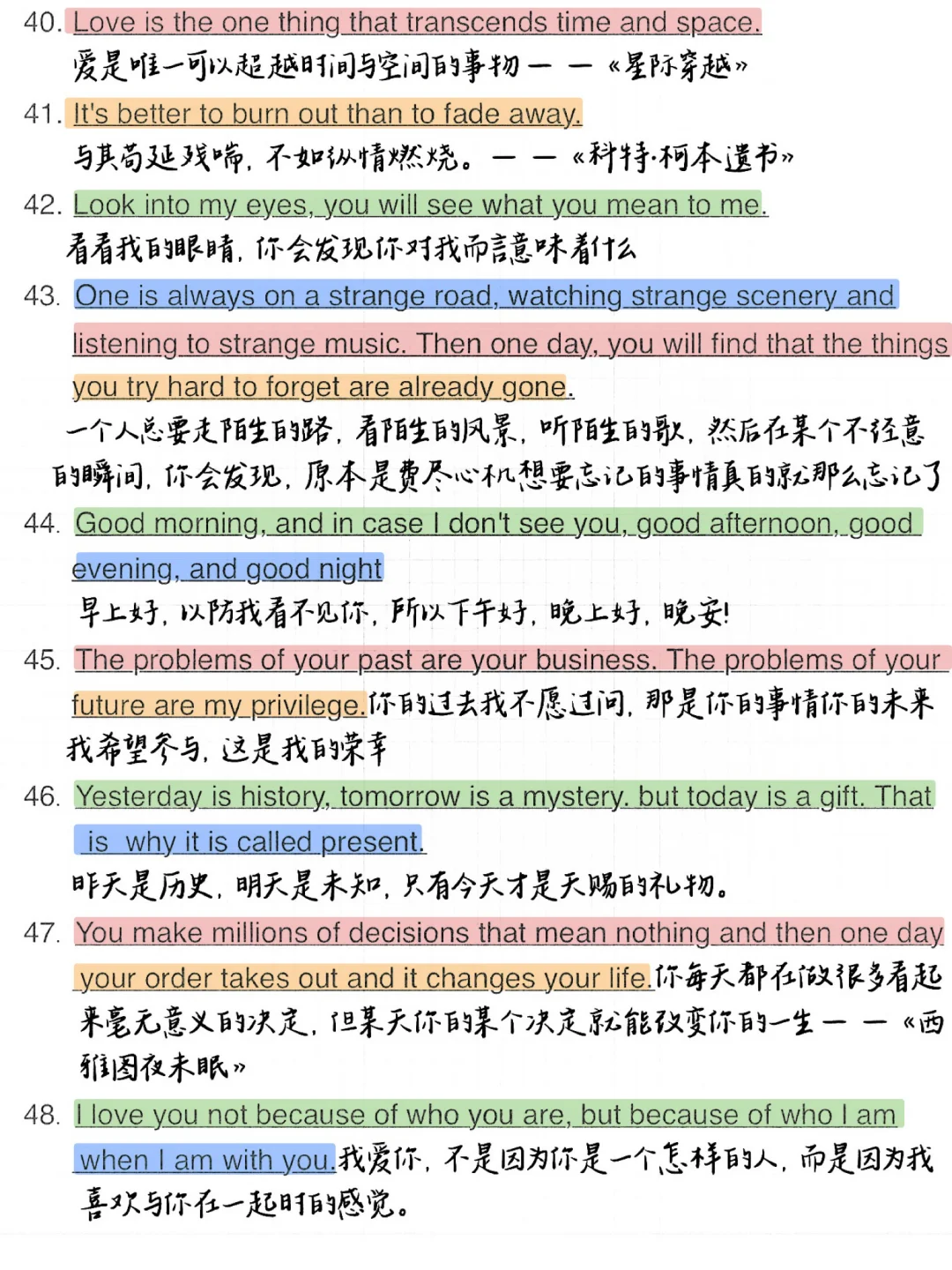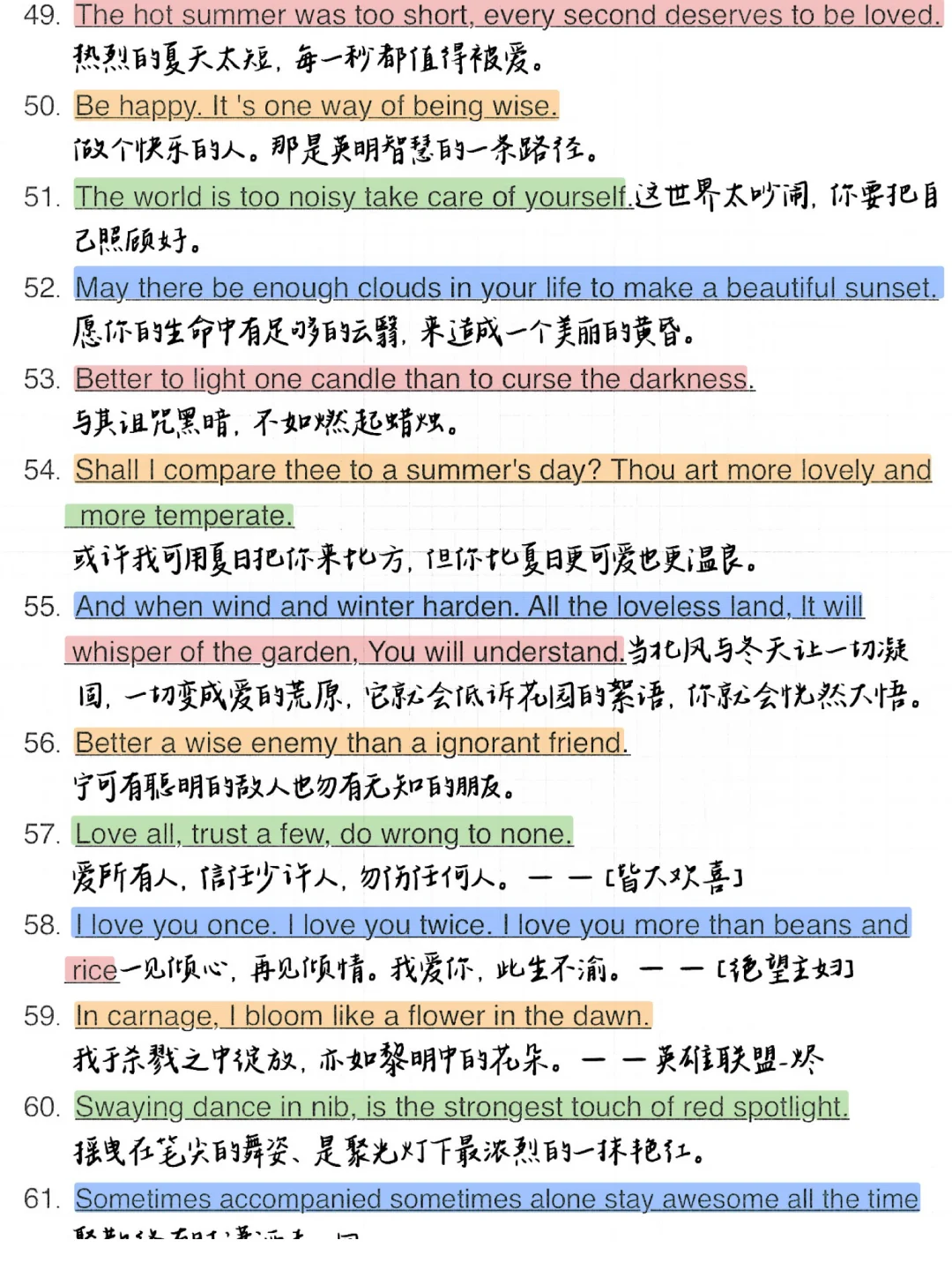 1. Meet you like the wind.遇见你,温澜如风。 2. Live long and prosper.生生不息,繁荣昌盛。 3. And forever has no end.永永远远,永无止境。 4. There is always a better way.总有更好的办法。 5. Better be your own universe.不如做自己的宇宙。 6. The longest day has an end.最难过的日子也有尽头。 7. No pains, no gains.一分耕耘,一分收获/不劳则无获! 8. I met you dead wood for spring.我遇见你,枯木逢春。 9. You are gentle with the sun set glow.你与霞光共温柔。 10. We all meet better ourselves.我们终将遇见更好的自己。 11. Born sensitive, lonely and happy.生而敏感,孤独而快乐。 12. May everything you meet be gentle原你所遇皆是温柔。