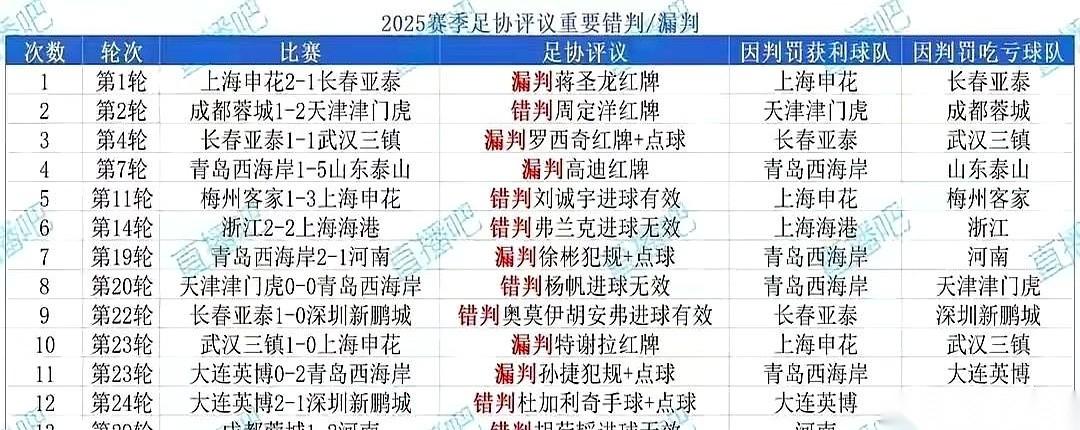 5分。 就因为这5分,一个本来板上钉钉的冠军,飞了。 我看到那份错漏判统计的时候,真的一口老血差点喷出来。成都蓉城,辛辛苦苦一整年,踢得荡气回肠,那股劲儿,谁看了不竖个大拇指? 结果呢? 最后发现,决定你命运的,不是对手的临门一脚,也不是你自己的战术失误,而是裁判的一声哨子,一个莫名其妙的VAR回看。 这感觉就像什么? 你吭哧吭哧考了全年级第一,结果老师跑过来说,不好意思,有几道题我给你判错了,你现在是第三。 你什么心情?你找谁说理去? 这5分,到底是谁偷走的?这责任谁来负? 一句“业务不精”,就完了?俱乐部真金白银的投入,球员拼了命的汗水,上万球迷嘶吼的嗓子,就这么被轻描淡写地“错漏”掉了? 说句扎心的话,我不是成都球迷,但我为他们感到不值。 更让我堵得慌的是,明年,代表咱们中超脸面出去踢亚冠的,又是那支“唯一”的球队。我不是对谁有意见,我只是怕啊。 怕什么? 怕咱们在窝里斗得这么乌烟瘴气,一个本可以给日韩球队上上强度的“冠军”,硬生生被自己人搞成了第三。最后,派出去的还是那个“外战荣誉感”需要打问号的。 这损失的是成都一家吗?不,是我们所有人。 俱乐部投了那么多钱,球迷付了那么多感情,不是为了陪着看一出荒诞剧的。 这中超,还能让人放心地玩下去吗? 我不知道。