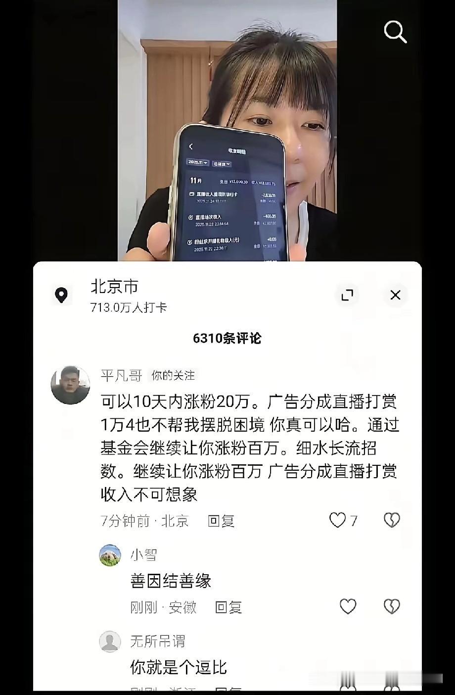 平凡哥与北京女摩托博主小一的事,引发了网友的热烈讨论。 事情的起因是,女摩托博主小一在马路口等红绿灯时,摩托车上的音响正放着歌。此时,平凡哥从后面过来,要求女摩托博主播放一首《平凡日子里的挣扎》。起初,女摩托博主拒绝了,称没有这首歌。在平凡哥的再三请求下,小一上网搜索并找到了这首歌。音乐响起,平凡哥夸赞女摩托博主的音响效果好,可他的表情却逐渐失控,大声喊出“每个人活着都不容易”,还重复了好几遍。 女摩托博主小一将这段偶遇视频发布到自己的自媒体账号上,播放量达千万,引发网友共鸣。音乐响起,平凡哥那句“每个人活着都不容易”,戳中了无数人的心。毕竟,很多时候大家活得都不轻松。 网友纷纷在小一的作品下留言点赞,她的粉丝量也从几万短短几日涨到了几十万。小一抓住热度开启直播,没想到很多网友来直播间刷礼物支持她,让她获得了一些收益。小一想到还有很多人面临困境,便决定将几场直播的13000多元收益捐给韩红爱心基金会,希望能帮助更多人,送去温暖。她把捐款荣誉证书发到自媒体账号后,又赢得了网友的一致好评。 然而,这却引起了平凡哥的不满。他开启自己的自媒体账号直播,埋怨女博主因他而火、涨粉几十万,却不帮他摆脱困境,反而把直播收益捐给基金会。他质疑小一捐款是为了涨粉,还说她没热度时不捐,哪怕拿出自己的5000元捐也会让人佩服,认为她是花大家的钱捐款给自己涨粉。一气之下,平凡哥举报小一视频侵权,导致视频被下架。 有人劝小一,真正需要捐款的人就在眼前,没必要和思想不健全的平凡哥置气,就当他是小孩或残疾人。大家都看出平凡哥思想有问题,可这是天生的,他也没办法,希望小一能大度些、多理解。平凡哥想要的不过是一点钱,在这么好的流量面前,他背着蛇皮袋开心离开,没有丝毫留恋,还说只想要点钱改变现状,不想当网红。要是给其一万元,他估计会开心得不得了。 明眼人都能看出,平凡哥在网络上的表达,像是被有所图的人软性控制了。不然,他们和小路三人本可以有一个圆满的故事,这才是平凡人所期望看到的。哎,只可惜平凡哥脑子不太好使,被人利用了。 对此,大家怎么看?