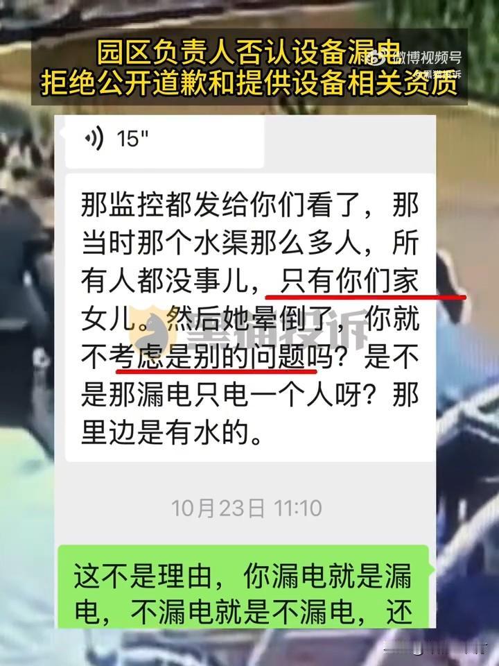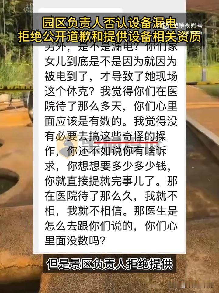 5岁孩子在游乐园遭电击受伤,为何园区矢口否认? 近日,南京李女士带着5岁女儿在松鼠部落森林假日公园游玩时,孩子在一个大木箱旁踩水,突然浑身抽搐,昏倒在地! 经过ICU住院治疗,孩子被诊断为“电击伤”,事发后景区负责人称这是“孩子自己摔倒”与园区无关! 甚至嚣张的反问家长:“所有人都没事儿,只有你们家女儿晕倒了,就不考虑是别的问题吗?” 就冲他的态度,就该打丫一顿!孩子在你景区受伤,你没有任何关心和致歉,而且怀疑这怀疑那!急着撇清责任! 不用废话,报警,先查他景区电力设备所有资质证明和巡检保修记录,跑不了他的责任!