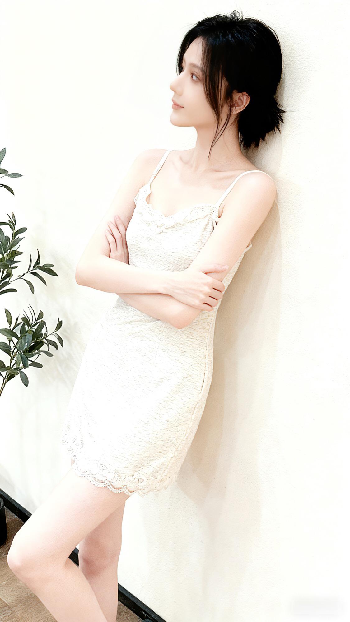 身着一袭蕾丝吊带短裙,简约而不失精致的设计,勾勒出独有的柔美与风情,在静谧中绽放无尽魅力。