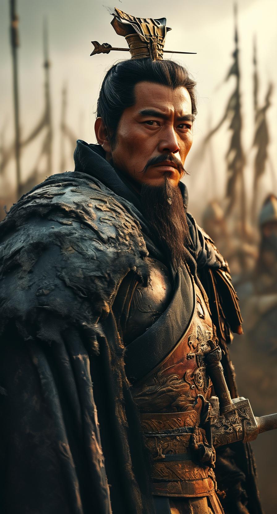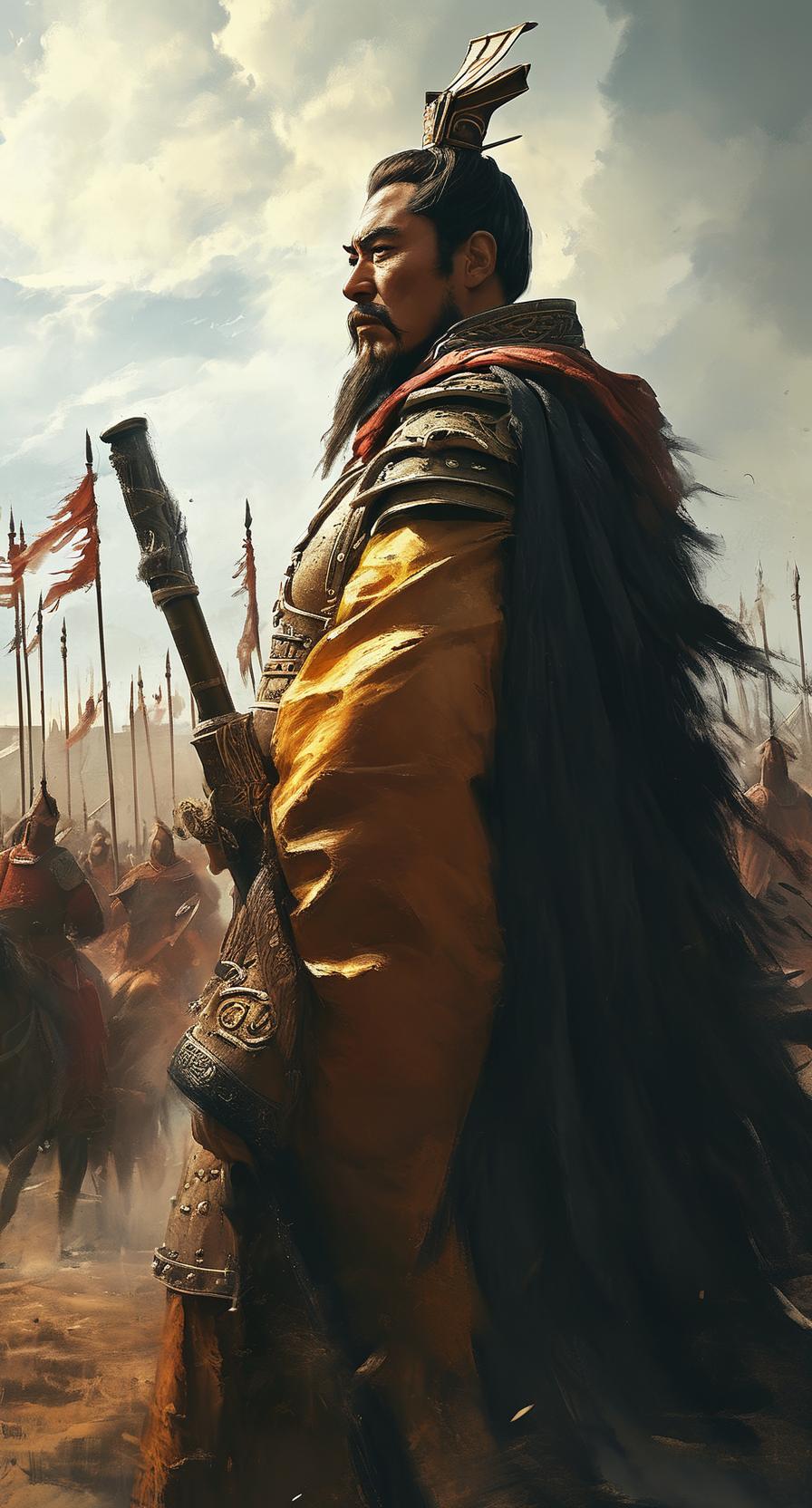 在那片荒凉的战场上,一位身披金碧辉煌战袍的古代英豪屹立于尘埃之中。天色阴沉,乌云密布,遮挡了刺眼的阳光,仿佛整个世界都被笼罩在一层厚重的阴影之中。空气中弥漫着硝烟的味道,尘土飞扬,伴随着破碎的旗幡和倒塌的兵器碎片,诉说着刚刚结束的激烈战斗。此刻,这位英豪站在废墟之上,身影高大而孤寂,却又散发出无比的威严与自信。 他的战袍金光闪烁,宛如天上的日轮,耀眼夺目。那是一件用上等锦缎缝制而成的战袍,绣满了龙凤祥云,细腻的金线在暗色底布上熠熠生辉。龙腾云起,凤舞九天,祥云缭绕,似乎在诉说着他的非凡身份与荣耀。每一针每一线都凝聚着匠人的心血与技艺,也象征着他身上那份不可动摇的王者之气。战袍的边缘镶嵌着细腻的金线流苏,随风轻轻摇曳,仿佛在诉说着古老的传说。 这位英豪的面容刚毅而冷峻,双眼如炬,透出坚韧与智慧。他的眉宇间透露出一股不屈的精神,那是经历无数战火洗礼后沉淀下来的沉稳与果断。长长的黑发束在头顶,用一根金丝缠绕成发髻,显得庄重而威严。他的身形高大挺拔,肌肉线条分明,显示出长年战斗的锻炼与磨砺。手中握着一柄古朴的长剑,剑鞘雕刻着精美的花纹,剑锋在微光中泛着寒光,似乎随时准备迎接下一场战斗。 此刻,他站在战场中央,似乎在等待着新的挑战。天空的乌云仿佛也在为他的气势所震慑,压抑着即将到来的风暴。远处的山峦轮廓模糊,仿佛在向他致敬,也在暗示着未来的战事还未结束。虽然战场上满目疮痍,但他身上的那份英勇与荣耀却如同一束光,穿透阴云,照亮了整个荒凉的天地。 他的心中没有恐惧,只有坚定与信念。经历过无数次生死考验的他,深知胜利的意义,也明白自己肩负的责任。这场战斗,不仅仅是为了个人的荣耀,更是为了家国的安宁。那金碧辉煌的战袍,象征着他对国家的忠诚与热爱,也代表着他无畏的精神。在这片荒凉的战场上,他如同一尊不倒的雕像,静静地伫立着,等待着下一次的风云变幻。 阳光被乌云遮蔽,但他的身影依然坚韧不拔,像是一座永不倒塌的丰碑。那金光闪烁的战袍在阴沉的天空下依然熠熠生辉,彰显出无与伦比的荣耀与尊贵。或许,未来的某一天,他会带领众人迎来和平的曙光,但在此刻,他只是静静地站在那里,用那份不屈的意志迎接着风雨的洗礼。荒凉的战场因为他的存在而变得更加庄严,也因为他的坚守而充满希望。那身战袍,成为他永恒的象征,铭刻在历史的长河中,成为后人敬仰的英雄传奇。古战场英魂