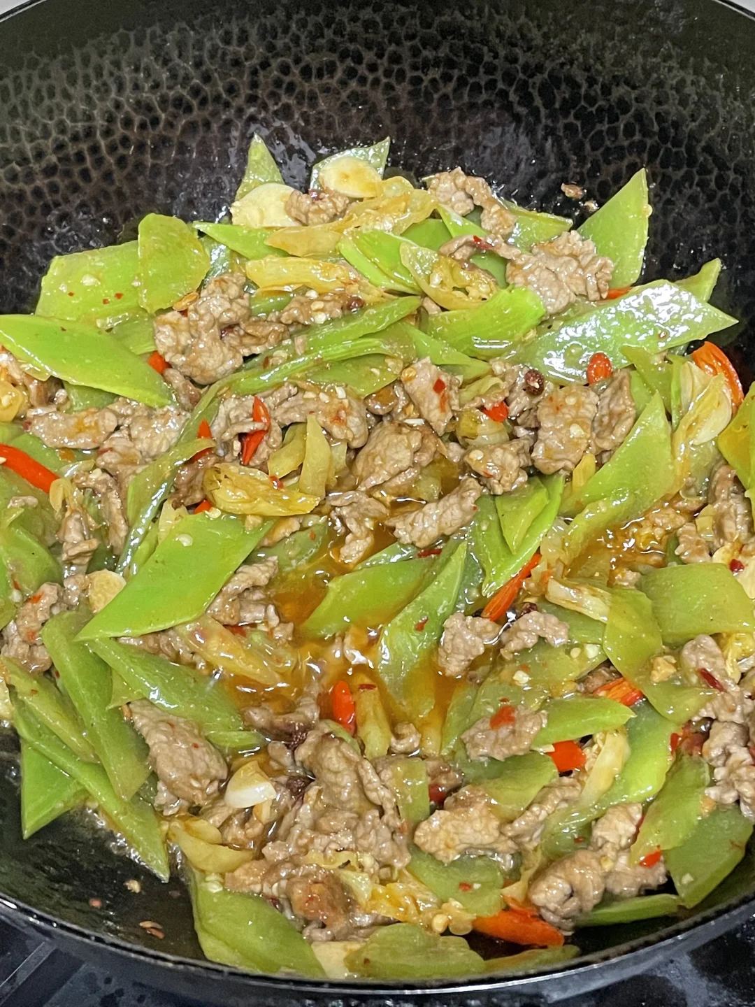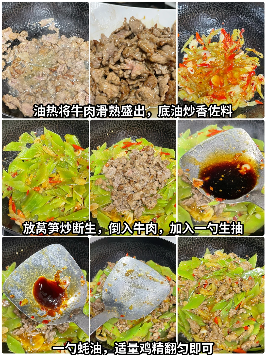 3⃣️起锅烧油,油热将牛肉滑熟盛出,锅里的底油炒香小米辣,蒜、泡椒、糍粑辣椒。放入莴笋炒断生,加入牛肉,放入1勺生抽,1勺蚝油,适量的味精,翻匀即可。