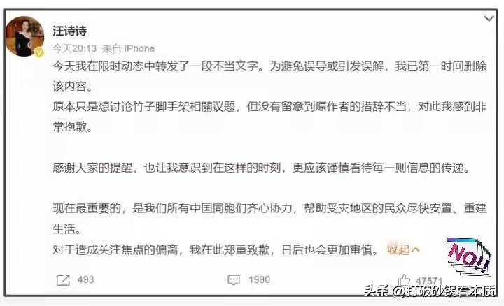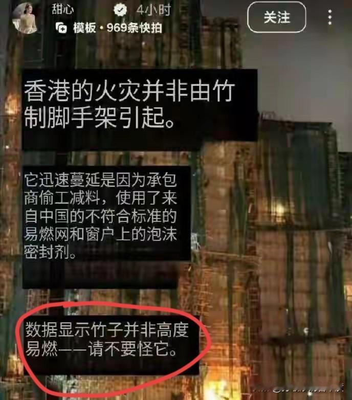 甄子丹辛辛苦苦积攒的好口碑,差点让媳妇一句话给毁了。真是“不怕神一样的对手,就怕猪一样的队友”! 面对香港这场让人揪心的大火,汪诗诗竟然发了这种内容?虽然秒删道歉,但这波操作真的太败好感了! 就在大家都在为火灾祈福、担心同胞安危的时候,作为公众人物的家属,不求你捐款捐物,但至少别在这个节骨眼上“添堵”吧? 汪诗诗称竹制脚手架并非高度易燃的这番言论,直接点燃了网友的怒火。这次我站网友!不管你是谁的老婆,在大灾大难面前“乱说话”,被骂真的一点都不冤。 虽然后面她反应很快,立刻删帖并公开道歉,说自己是“无心之失”,但互联网是有记忆的。 甄子丹演了一辈子“叶问”,讲究的是家国情怀。做老婆的,在这个时候更应该谨言慎行,别让枕边人难做啊。 公众人物享受了聚光灯的红利,就得承担相应的社会责任。 对于汪诗诗的这次“秒删道歉”,大家觉得她是真的知道错了,还是迫于舆论压力?甄子丹会受影响吗?