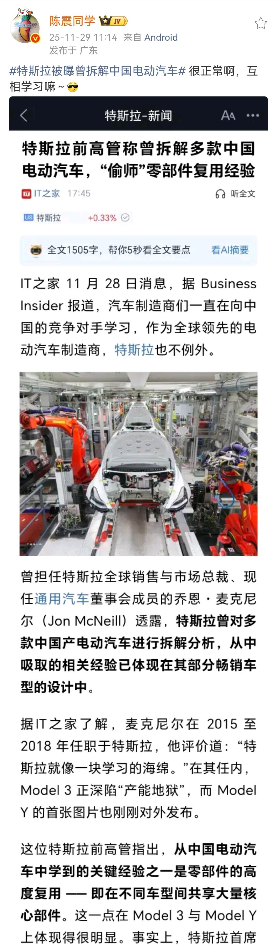陈震:特斯拉被曝曾拆解中国电动汽车,很正常啊,互相学习嘛~[酷] 以前都是中国车企拆外国的牌子,现在轮到了外国牌子开始拆解中国电动车。 特斯拉不是第一个这样做的,此前日本的相关研究机构甚至把五菱宏光mini EV给全部拆解出来了,写了一本非常厚的书。 各位是怎么看的?欢迎评论区留言。