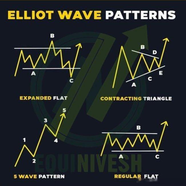 1. 左上角:扩展平台形英文名称:EXPANDED FLAT (或 Running Flat)形态类型:调整浪(的一种变体)核心特征:在A-B-C结构调整中,B浪的终点会超过A浪的起点(即反弹创新高),随后C浪会剧烈下跌,但通常不会跌破A浪的低点。市场含义:这是一种非常强劲的调整形态。它表明当前的主趋势力量极强,以至于调整阶段的反弹(B浪)反而超出了常规水平。这通常预示着调整结束后,主趋势将继续强劲发展。2. 右上角:收缩三角形英文名称:CONTRACTING TRIANGLE形态类型:调整浪核心特征:由a-b-c-d-e五个子浪组成,每个浪都是三浪结构。整个形态的波动范围逐渐收窄,形成锥形。市场含义:表示市场多空力量暂时平衡,犹豫不决,成交量通常会收缩。三角形调整浪通常出现在主趋势的最后一波调整(如第4浪)中,之后价格将朝着原趋势方向突破,开启新一轮驱动浪。3. 右下角:五浪驱动模式(脉冲浪)英文名称:5 WAVE PATTERN (即 Impulse Wave)形态类型:驱动浪(最基本的形态)核心特征:与主趋势同向,由5浪构成(1-2-3-4-5),遵守三大铁律(浪2不回调浪1的100%;浪3不是最短的;浪4不进入浪1价格区域)。市场含义:代表趋势的主要推动力量。这是市场中最具爆发性的阶段。4. 左下角:规则平台形英文名称:REGULAR FLAT形态类型:调整浪核心特征:在A-B-C结构调整中,B浪的终点大约与A浪的起点持平,而C浪的终点则与A浪的终点大致持平。整个形态呈横向整理。市场含义:表明市场趋势强劲,调整只是暂时的休整,多方(或空方)不愿过多让步。调整结束后,原趋势将继续。