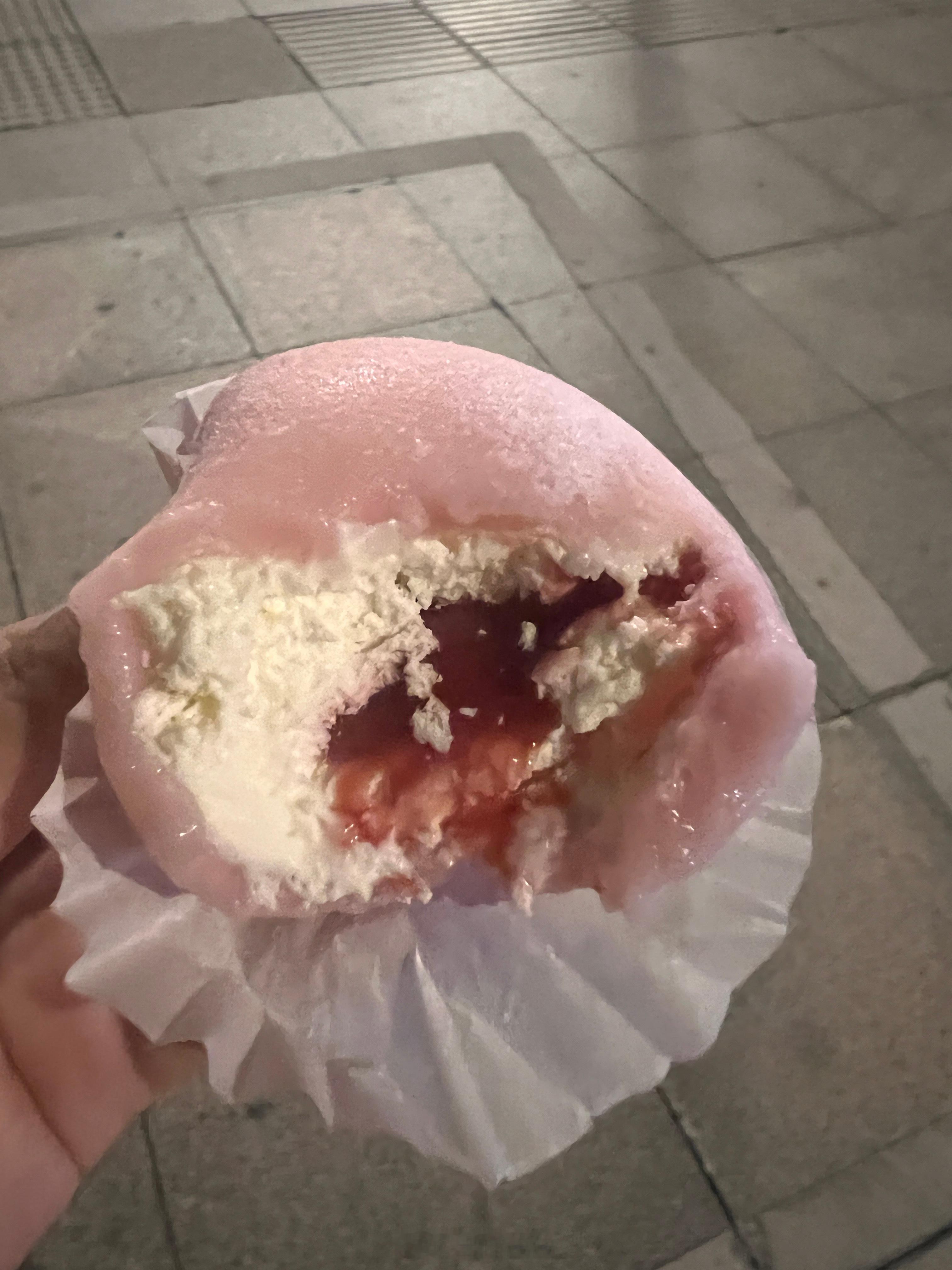 沃尔玛的草莓大福巨好吃啊,沃集鲜,真的可以。糯米皮软软的,也不粘牙,奶油搭配新鲜果酱很香,一点都不腻,冲
