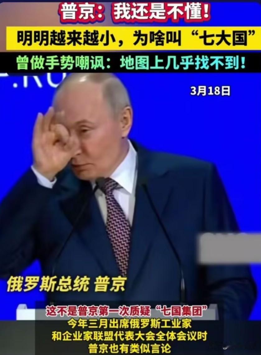 哈哈,普京说得也太精辟了,关键那是手势太到位了。 普京:我真的不明白,他们为什么称为“七国集团”,就人数,领土,人口和对全球GDP的贡献而言,哪儿就大了,无论你看哪里,地图上都看不到。 G7,美国、日本、德国、英国、法国、意大利和加拿大,也就是1+6。 普京说话水平确实高,不知道那几个有没有听到,会作何感想。 还不是看美的眼色行事,普京真是一点面子也不给他们啊。