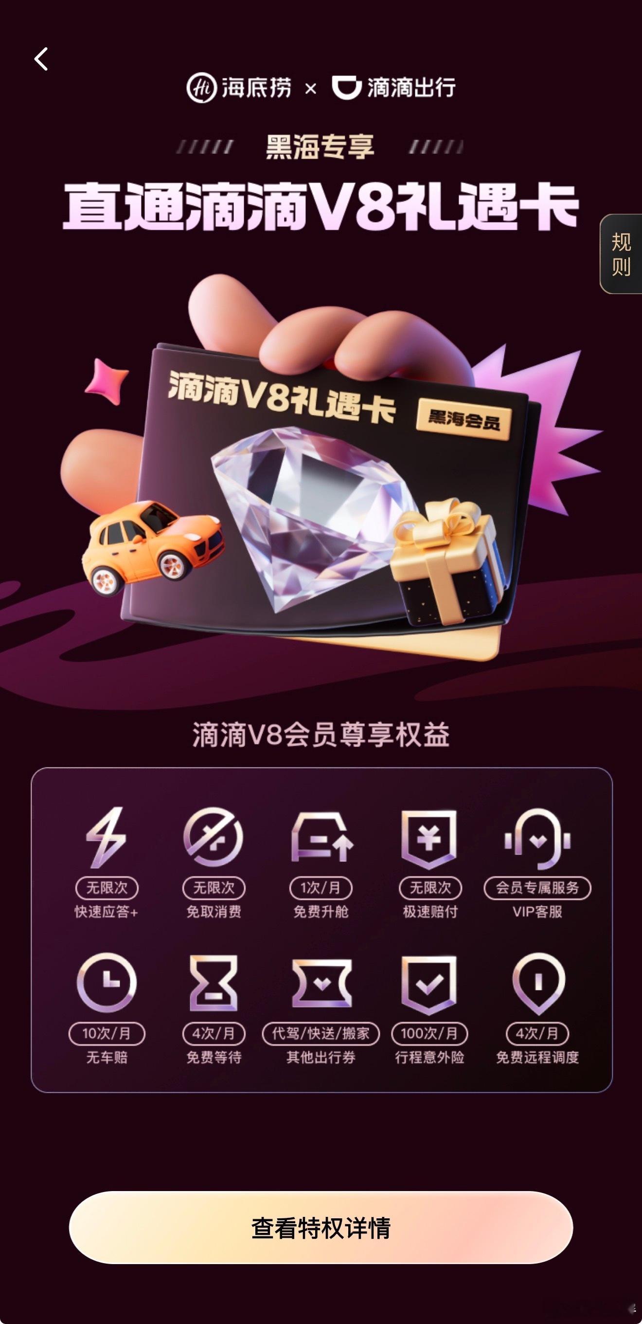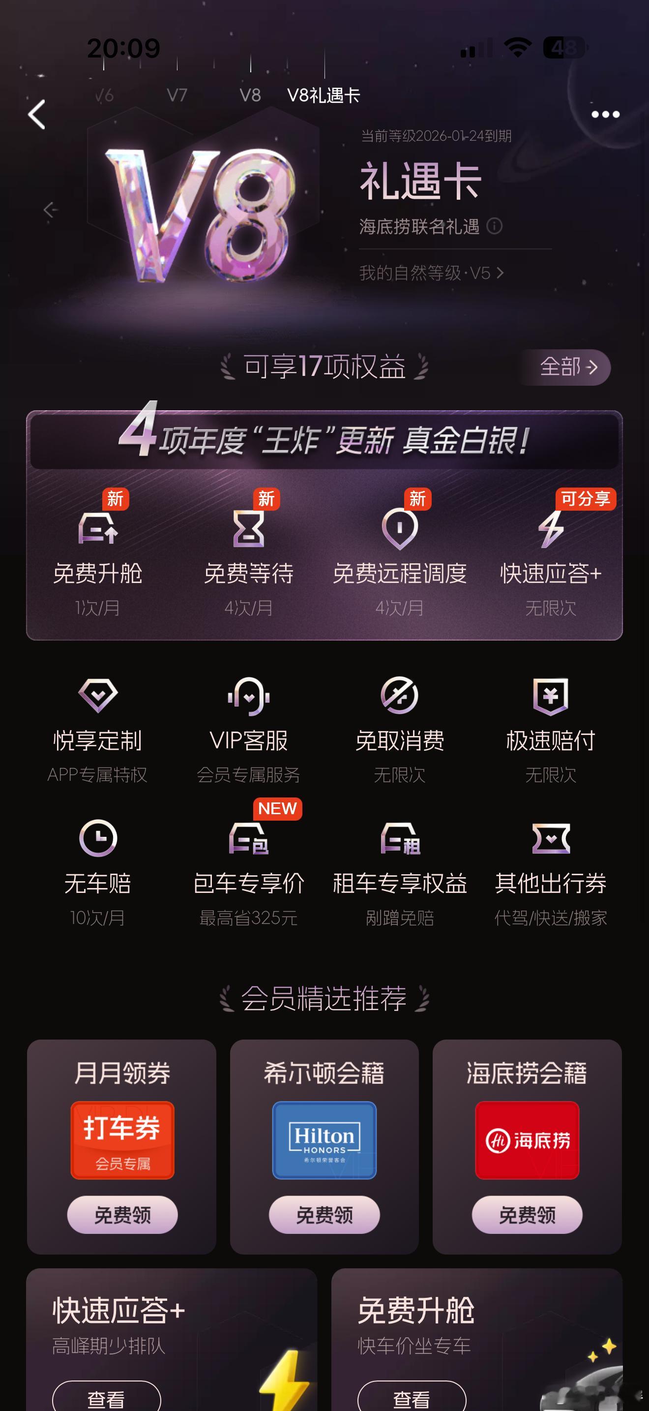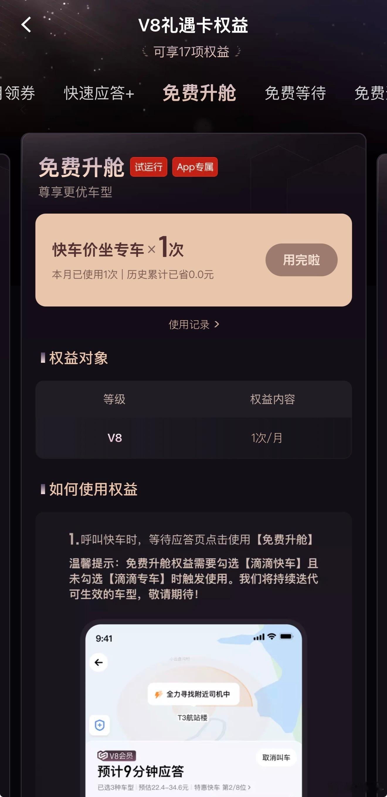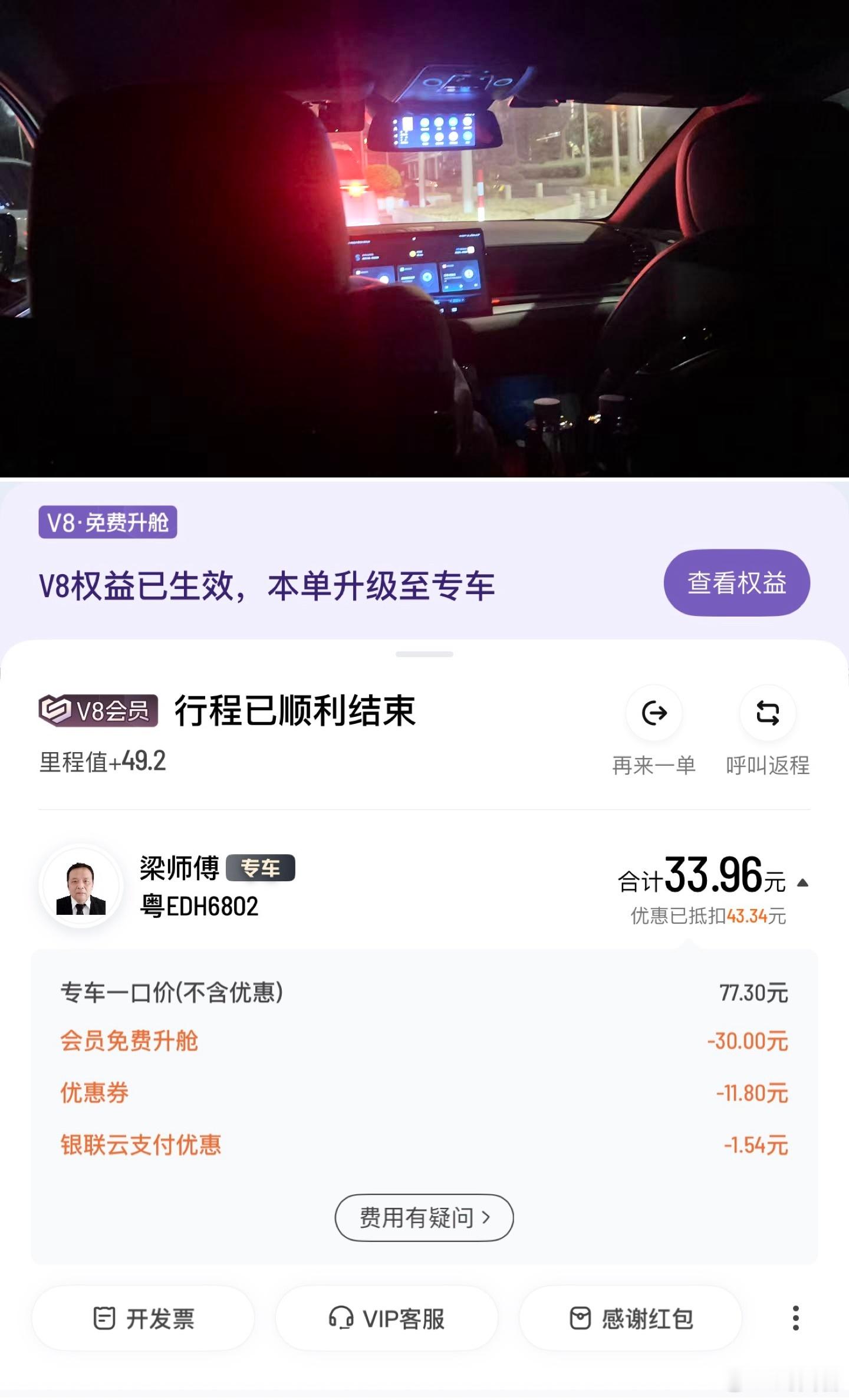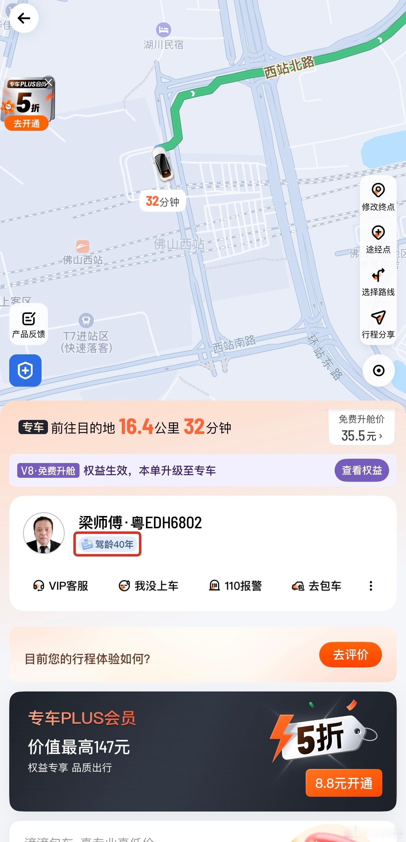 家人从高铁站回来,我帮忙打滴滴,刚好这个月滴滴 V8 免费升舱专车权益没用,打到了 其实打了几次才碰到汉(还打到过有零跑,零跑也能做专车…)另外司机驾龄居然有 40 年(图2)最后就是用快车价格坐了专车(图3)确实很香!这个滴滴会员 V8 卡是 送的礼遇(图5)打车时还挺实用的!