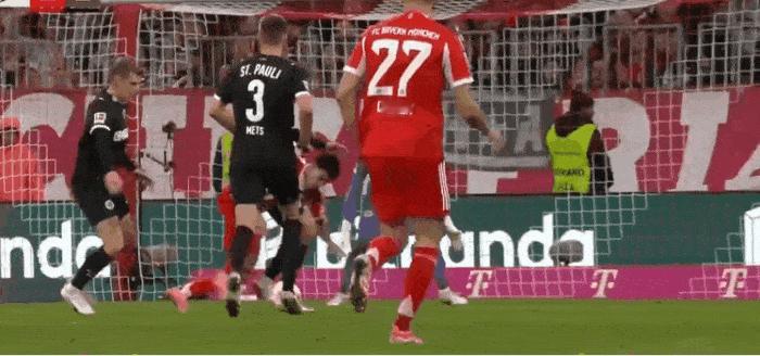 德甲半场战报:拜仁81%控球难破局 格雷罗爆射扳平 卡尔+比朔夫两中柱1-1圣保利 第6分钟,拜仁后场基米希与莱默尔配合失误,拉格断球直塞,洪通吉扛开金玟哉突入禁区破门,圣保利1-0领先。此后拜仁掌控节奏,控球率高达81%,持续施压。 第34分钟,格雷罗接队友边路传中,禁区外一脚爆射轰开对手球门,帮助拜仁1-1扳平比分。上半场尾声阶段,圣保利攻势不减,卡尔与比朔夫先后击中立柱,错失反超良机,半场双方握手言和。