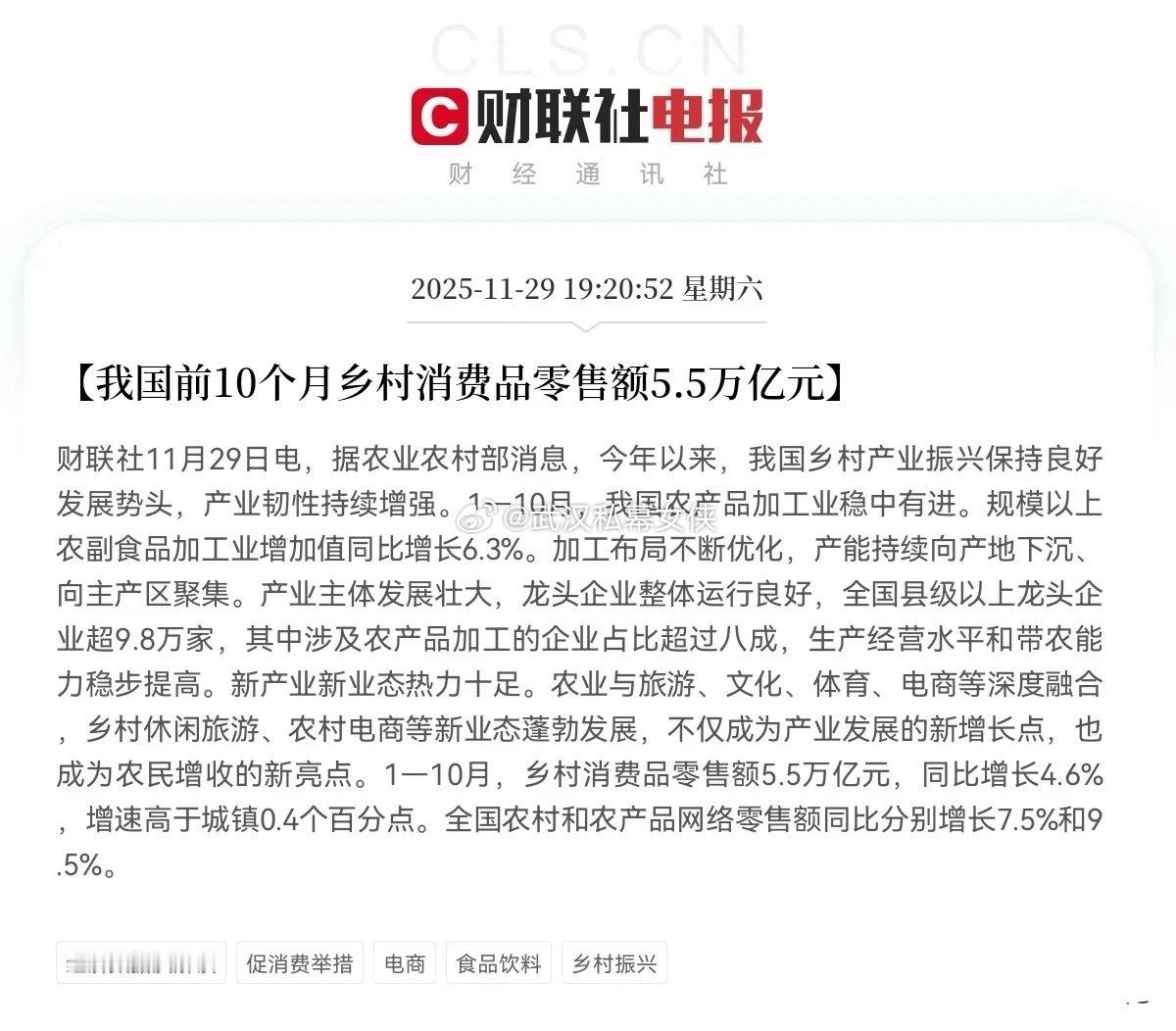 深夜大利好!乡村振兴来利好消息了!下周乡村振兴概念有望迎来大爆发,持有这个板块的此刻估计又要兴奋的睡不着了农业农村部最新消息,今年以来,我国乡村产业振兴保持良好发展势头,产业韧性持续增强,数据显示,我国前10个月乡村消费品零售额突破了5.5万亿,同比增长4.6%,这个消息对于乡村振兴是一大利好,这说明当前乡村人的收入是不错的,钱包鼓鼓的,看来乡村消费活力正在逐步增强,乡村消费市场正在持续复苏,这个消费能力可一点也不比城镇消费能力差啊,乡村地大物博本身具有庞大的消费市场,随着政策的发力,乡村消费有望在促进消费的行动中扮演着重要的角色,乡村振兴相关产业链公司将迎来最好的发展机遇,值得期待!股民们,坐稳扶好,受乡村消费数据持续向好的刺激,下周一乡村振兴概念有望起飞了,大消费要逐步稳起来了!