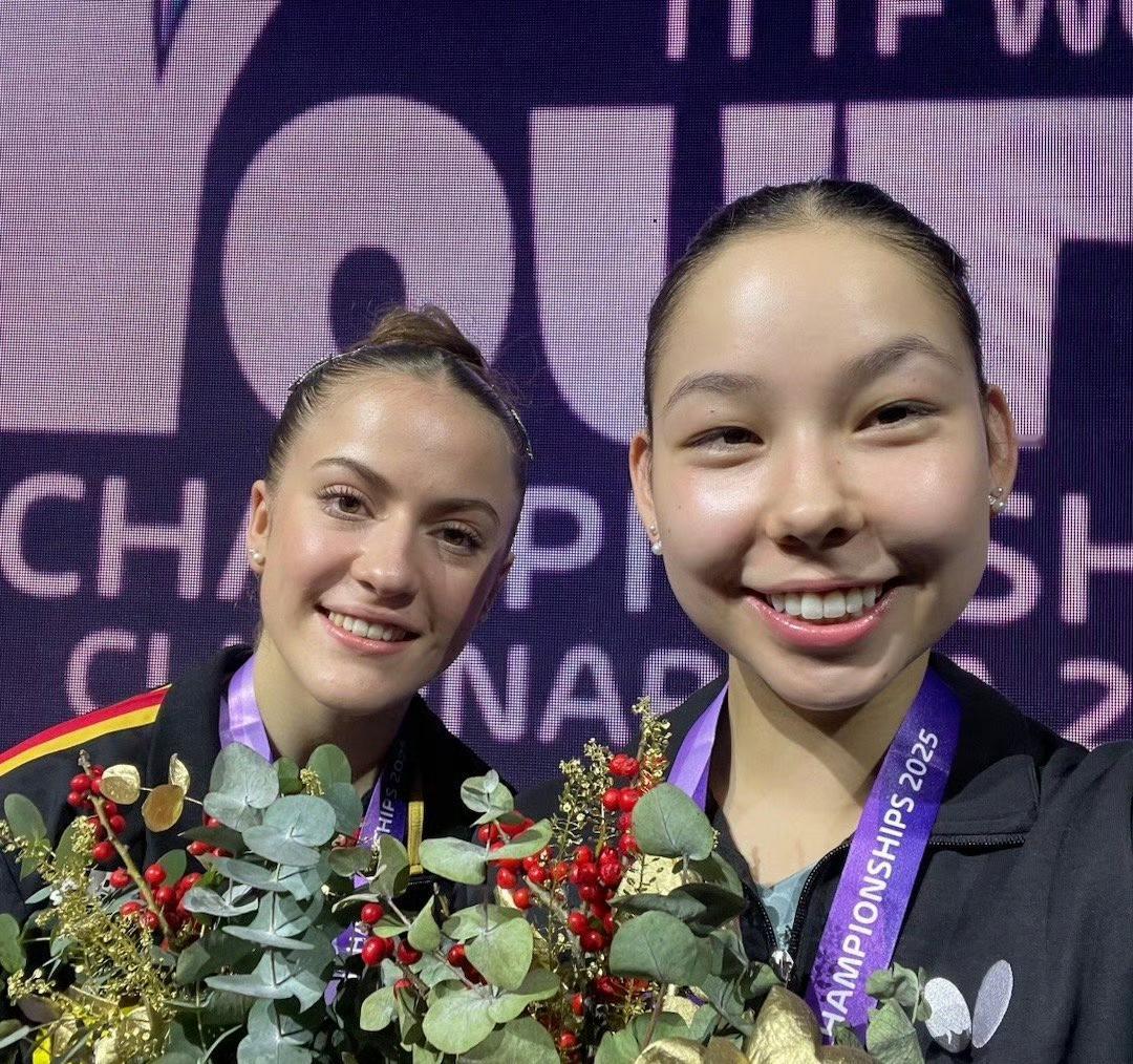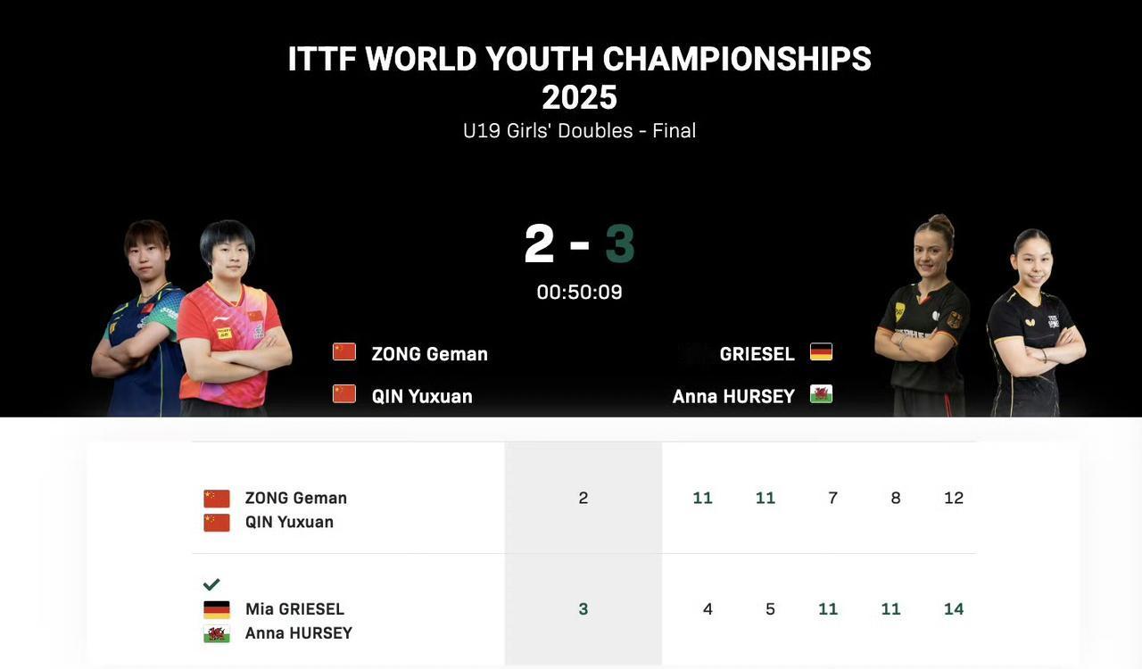 纵歌曼/覃予萱🇨🇳被让二追三,获得亚军! 对手又是赫西🏴! 2025世青赛U19女双决赛于今日凌晨两点多激战结束, 先胜两局的纵歌曼/覃予萱🇨🇳被对手让二追三,2-3不敌德国和威尔士的跨国组合格里塞尔🇩🇪/赫西🏴,丢冠拿银,五局比分为:11-4,11-5,7-11,8-11,12-14。 决胜局粽子蘑菇本来还是10-8领先的,丢了两个金牌点之后,比分来到12-11,又错失一个金牌点[震惊]。 有中国血统的英国威尔士选手赫西(图三右)很有实力,目前夺得女双冠军、混双亚军,带着一冠一亚的成绩,单打也进了四强,保底有牌,她应该算是U19里成绩最好的选手了。