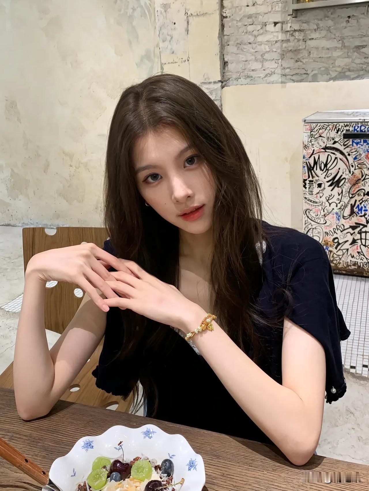 优雅气质少女,坐在现代简约风格的咖啡馆里,散发着温柔与自信。