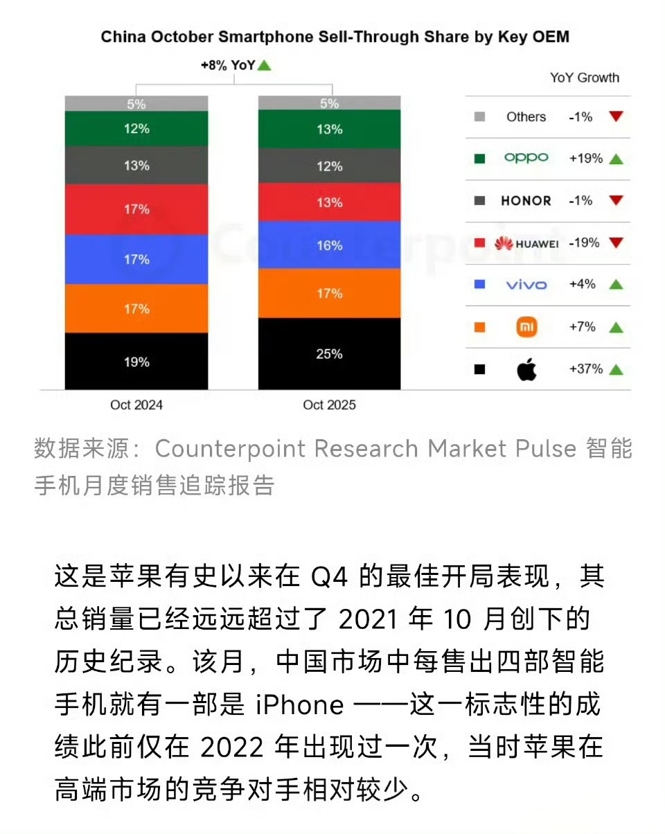 苹果10月全球手机份额飙至24.2%苹果挤牙膏的时候略微多一点力道,销量就能猛涨,可见品牌力不是一般的强……