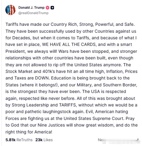 【黄金时代】感恩节,川普向上帝,为了美国许下心愿,愿大法官展现出极大的智慧,为美国做出正确的决定,维护特朗普关税川普:关税使我们的国家富裕、强大、有力且安全。几十年来,其他国家一直成功地利用关税来对付我们,但就关税而言,由于我所制定的政策,我们掌握了所有优势,而且在一位英明总统的领导下,我们将永远如此!战争已经停止,与其他国家的关系也更加牢固,尽管他们再也不能占美国的便宜了。股市和401k退休金计划都达到了历史新高,通货膨胀、物价和税收都在下降。教育正在回归美国(它本就应该在那里!),我们的军队和南部边境也达到了前所未有的强大。美国再次赢得了尊重,而且是前所未有的尊重。这一切都归功于强有力的领导和关税政策,没有它们,我们就会再次沦为贫穷可怜的笑柄。邪恶的、仇视美国的势力正在美国最高法院与我们对抗。向上帝祈祷,愿我们的九位大法官展现出极大的智慧,为美国做出正确的决定!美国和欧洲当代史川普主义研究热点现场海外新鲜事