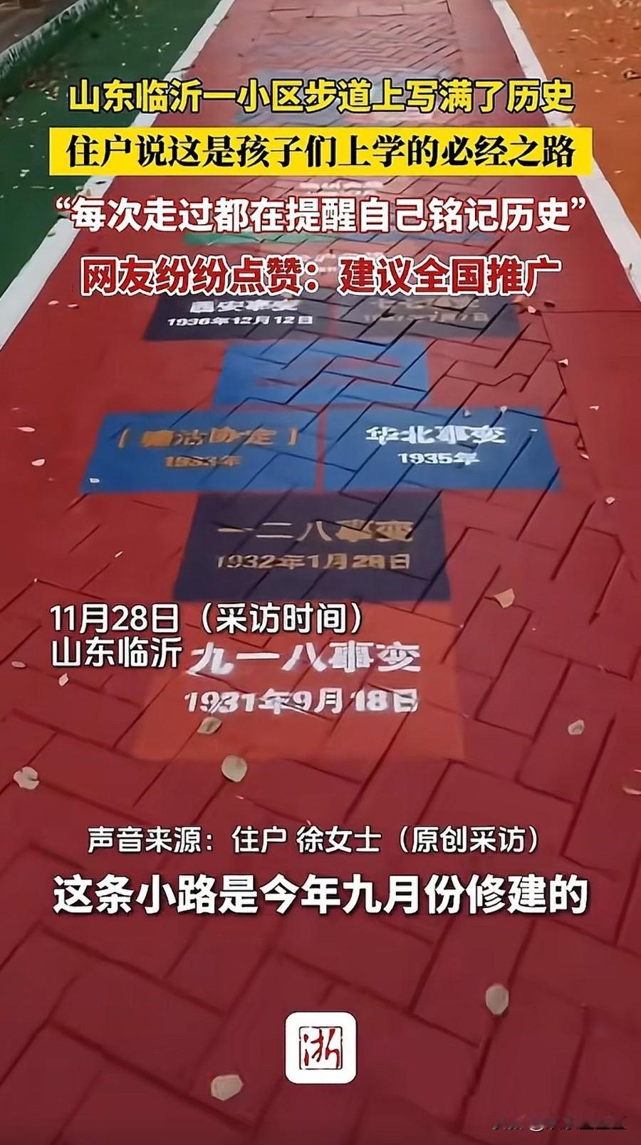 在山东临沂的一个小区里,有一条特殊的步道——红色的砖面上,清晰印刻着“九一八事变”“七七事变”“百团大战”等抗日战争关键节点,还有“爬雪山”“大会师”等长征足迹。这条今年9月修建的步道,是小区孩子们上学的必经之路。 住户徐女士说,每次走过,都能深深体会到先辈们的艰辛与付出,现在的幸福生活是无数先烈用热血和生命换来的。步道的设计也别具用心,一段浓缩了抗日战争14年的历史脉络,另一段则还原了红军长征的足迹,让孩子们仿佛“重走长征路”。 网友们纷纷点赞,有人建议“全国公园通道都写上这样的事件”,还有人呼吁在全国学校、企事业单位大力推广。这条步道的意义,正如大家所说,不是培养仇恨,而是让红色基因与爱国种子在下一代心中落地生根,永远铭记历史,奋勇前进。