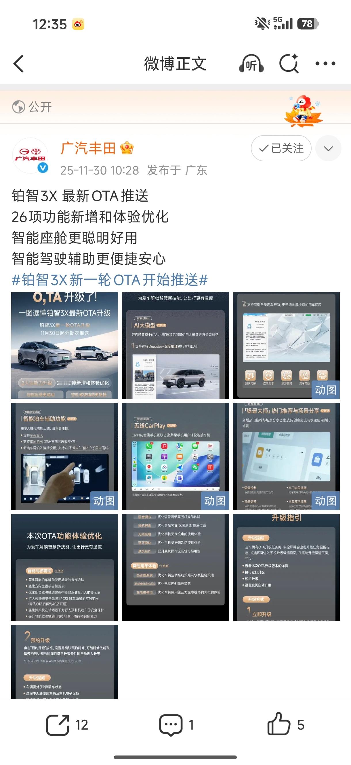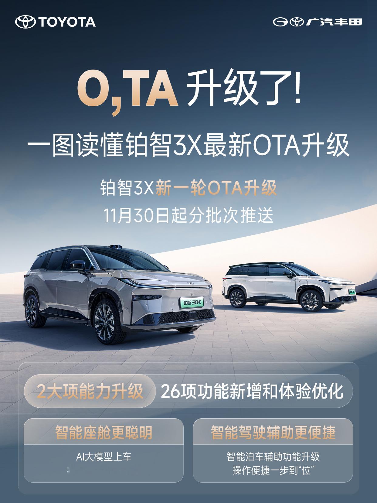 铂智3X年度重磅OTA正式推送 广丰还是很听劝的,用户要什么很快就加上了,从今天开始,铂智3X推送了一个大版本OTA,把用户要的、用户想的全给加上了。比如很实用的车头泊出、AI大模型上车、CarPlay等等,很难想象这是一个合资车企的速度和态度,值得点赞!