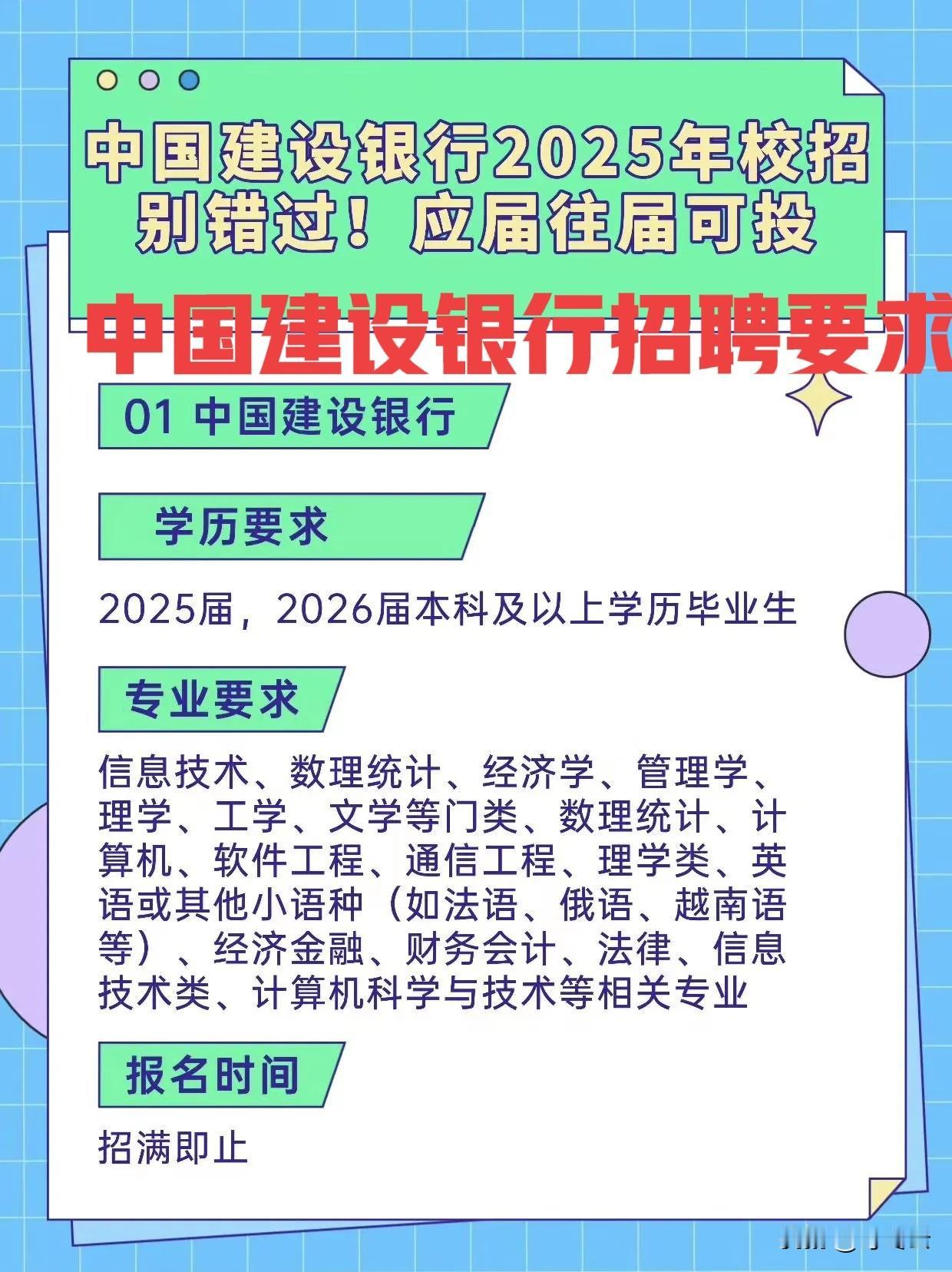 中国建设银行 2026 年招聘岗位要求及求职秘籍!宝子们,中国建设银行作为国有大型商业银行,在金融界那可是响当当的存在。它业务广泛,涵盖公司金融、个人金融、金融市场等多个领域,拥有庞大的客户群体和丰富的金融产品。2026 年建设银行的招聘已经拉开帷幕,今天咱们就来详细了解一下招聘岗位要求,再奉上超实用的求职秘籍。 中国建设银行 2026 年招聘岗位要求 综合柜员岗 ● 专业要求:专业不限,但金融、经济、会计、管理等相关专业优先。这些专业的知识能帮助柜员更好地理解金融业务和客户需求。 ● 学历要求:全日制本科及以上学历。本科及以上学历的人才通常具备更系统的知识体系和较强的学习能力。 ● 其他要求:形象气质佳,亲和力强,能给客户留下良好的第一印象;具有良好的抗压能力,因为柜员岗位业务量较大,工作节奏快。 客户经理岗 ● 专业要求:金融、市场营销、经济学等专业优先。这些专业背景有助于客户经理更好地开展客户拓展和金融产品营销工作。 ● 学历要求:全日制本科及以上学历,部分地区或高端业务岗位可能要求硕士学历。 金融产品经理岗 ● 专业要求:金融、经济、数学、统计等相关专业。这些专业知识能支持产品经理进行金融产品的设计和研发。 ● 学历要求:硕士及以上学历优先。高学历人才在理论研究和创新能力方面更具优势。 ● 其他要求:有金融产品研发或相关工作经验者优先;持有相关金融证书,如 CFA、FRM 等会更有竞争力。 风险管理岗 ● 专业要求:金融、数学、统计学、法学等专业。这些专业知识有助于进行风险评估和管理。 ● 学历要求:本科及以上学历,硕士学历优先。 ● 能力要求:掌握风险管理的基本理论和方法,能够对银行的各类风险进行识别、评估和监测;具备较强的数据分析和建模能力,运用数据模型预测风险;有良好的风险意识和合规意识,确保银行的业务活动符合监管要求。 ● 其他要求:有风险管理相关工作经验者优先;熟悉金融监管政策和法规。 求职秘籍 提前规划 ● 了解招聘信息:关注建设银行的官方网站、招聘公众号等渠道,及时获取招聘公告和岗位信息。提前了解招聘流程、时间节点和岗位要求,制定合理的求职计划。 ● 明确求职目标:根据自己的专业、兴趣和能力,确定想要应聘的岗位。不同岗位的要求和发展方向有所不同,明确目标可以有针对性地进行准备。 提升自身竞争力 ● 专业知识学习:针对目标岗位,系统学习相关的专业知识。可以通过阅读专业书籍、参加培训课程、在线学习等方式进行学习。例如,应聘金融产品经理岗,要深入学习金融市场、金融产品设计等方面的知识。 ● 技能提升:提高自己的办公软件操作能力、数据分析能力、沟通表达能力等。可以通过参加技能培训、实践项目等方式来提升技能水平。比如,学习 Python 进行数据分析,参加演讲比赛锻炼沟通表达能力。 ● 证书考取:考取与金融行业相关的证书,如银行从业资格证、证券从业资格证、基金从业资格证等。这些证书可以增加自己的竞争力,证明自己具备相关的专业知识。 面试准备 ● 了解银行和岗位:深入了解建设银行的发展历程、企业文化、业务范围和目标岗位的职责、要求等。在面试中能够准确回答关于银行和岗位的问题,展示自己的诚意和对岗位的了解。 ● 模拟面试:可以找朋友或老师进行模拟面试,提前熟悉面试流程和常见问题。在模拟面试中,注意自己的语言表达、肢体语言和回答问题的逻辑。 总结 中国建设银行 2026 年的招聘为广大求职者提供了丰富的岗位选择,但每个岗位都有相应的要求。大家要根据自身情况,明确目标岗位,提前规划,努力提升自己的竞争力。通过精心准备简历和面试,运用这些求职秘籍,增加自己成功入职的机会。如果你在求职过程中遇到任何问题,欢迎在评论区留言交流,祝愿大家都能顺利拿到中国建设银行的 offer! 欢迎关注@叮咚云 将优先为粉丝职业规划指导,1对1是付费咨询,为你定制最适合的就业择业方案!分享2025年最有价值的招聘真实数据统计分析,打破信息差和认知差,欢迎留言交流讨论。[来看我][来看我] 免责声明:图片来自网络,仅供参考!