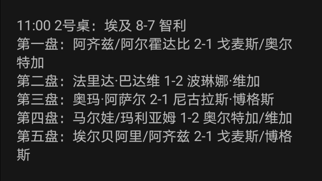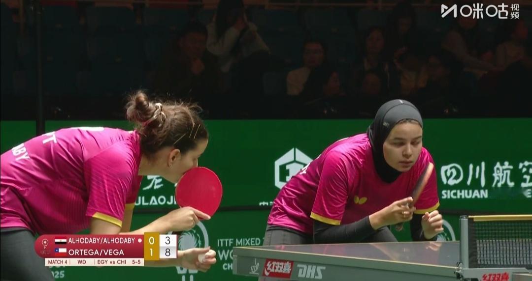 什么叫15局8胜制? A组埃及Vs智利表演给大家看! 成都混合团体世界杯 A组埃及队Vs智利队 埃及队是八号种子队,智利队是混团世界杯新军! 混双埃及2:1胜智利 女单埃及1:2负智利 男单埃及阿萨尔仅仅2:1胜智利 女双埃及1:2负智利 男双埃及2:1胜智利 埃及8:7险胜智利! 埃及胜,8胜! 这两支乒乓球队真是难兄难弟,还得拼得你来我去! 从11:00打到13:40分! 埃及一姐谢里芙没来,汉娜•高达还在旅途中! 埃及晋级第二阶段循环赛有点悬了!