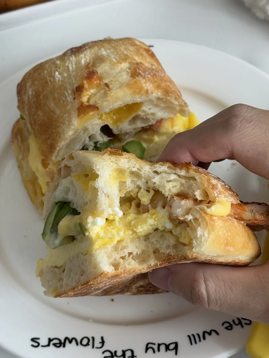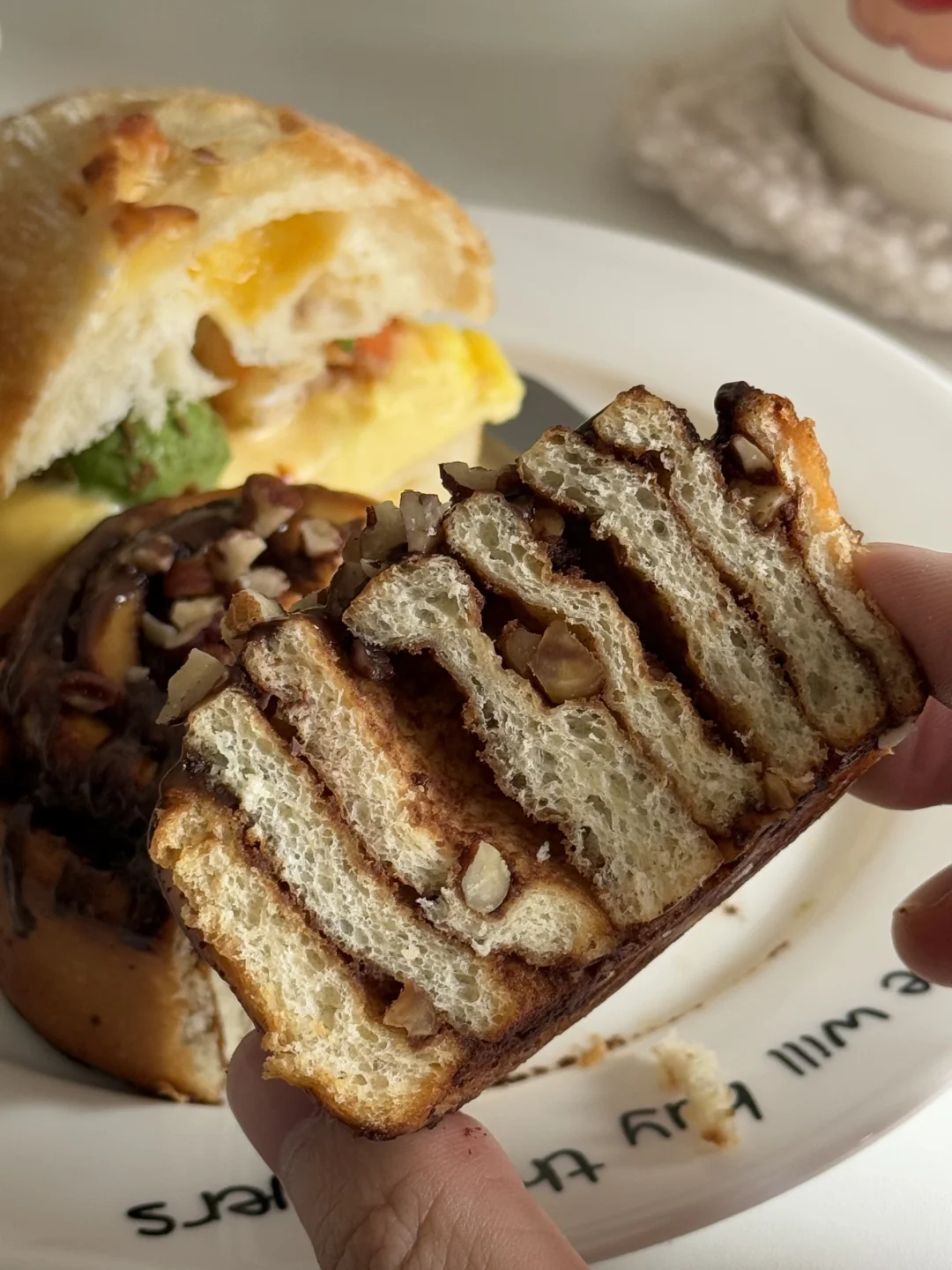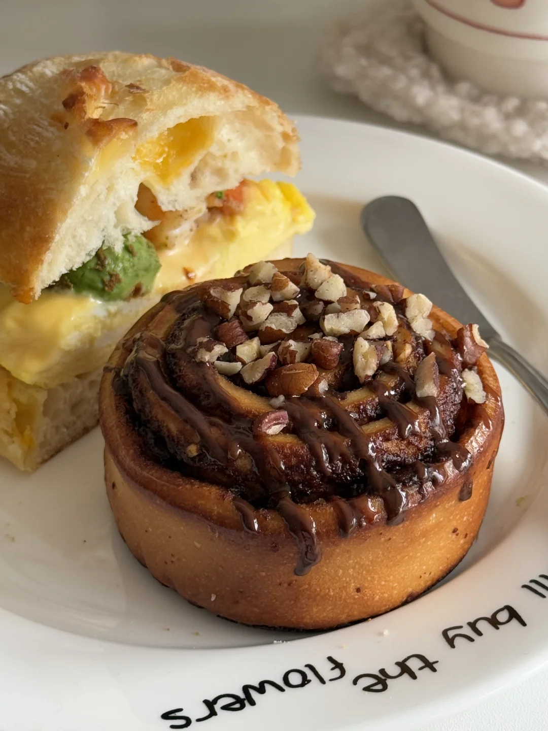 买了心心念念的恰巴塔 做了恰巴塔三明治🥪 - 山姆的肉桂卷还不错(对我来说 甜度感觉是微甜偏上 可能是淋了巧克力酱🍫 -