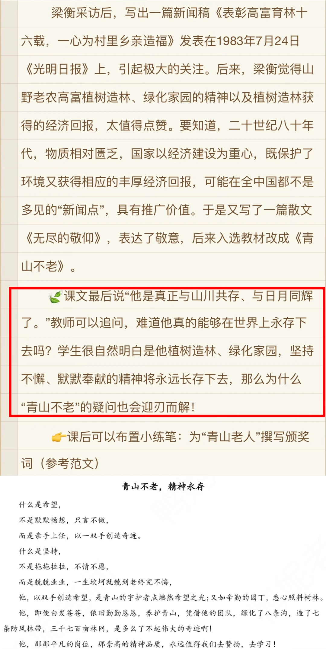 课上给学生补充背景资料,才能更好理解“不老”! 🍃课文最后说“他是真正与山川共存、与日月同辉了。”教师可以追问,难道他真的能够在世界上永存下去吗?学生很自然明白是他植树造林、绿化家园,坚持不懈、默默奉献的精神将永远长存下去,那么为什么“青山不老”的疑问也会迎刃而解!