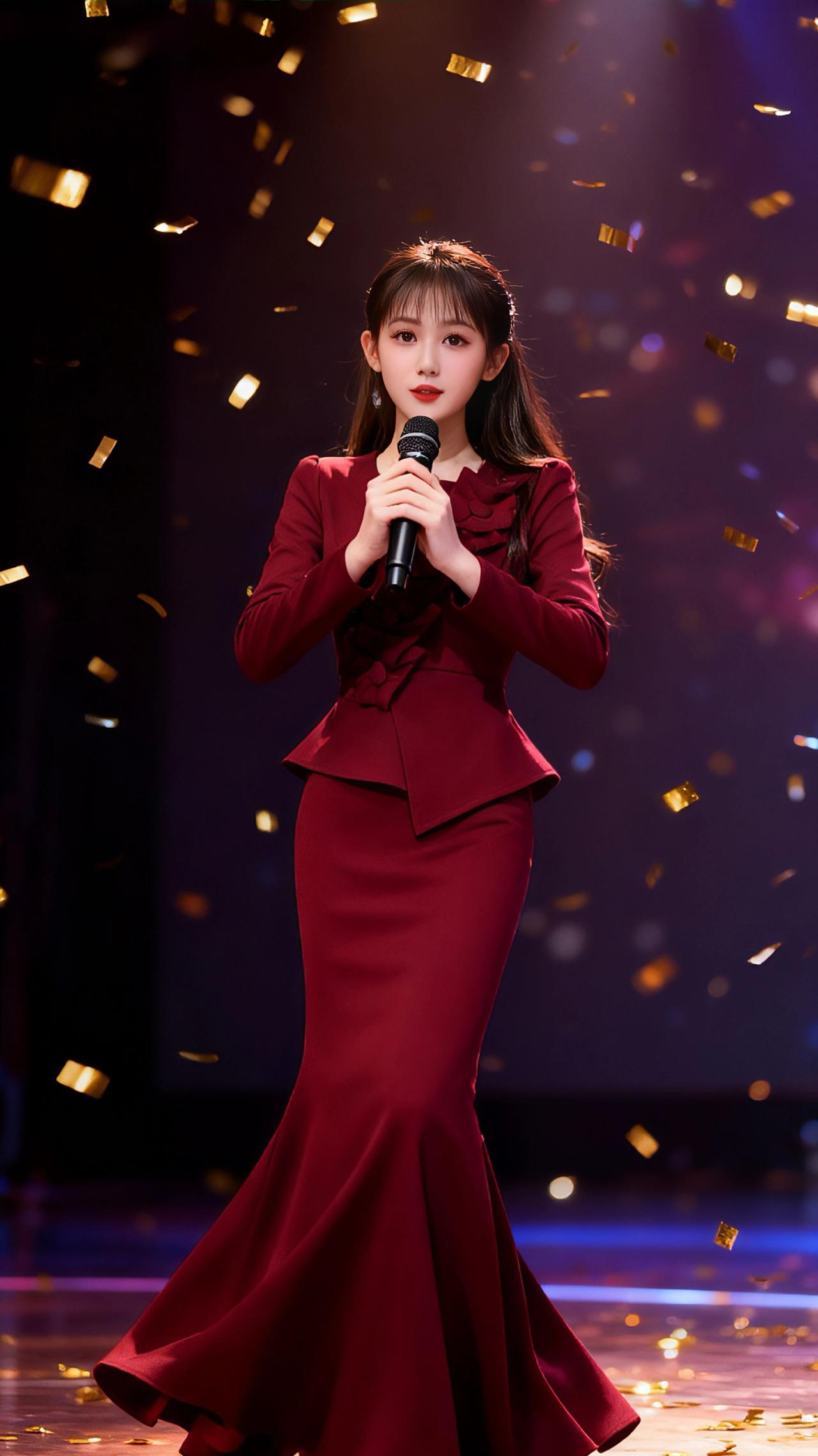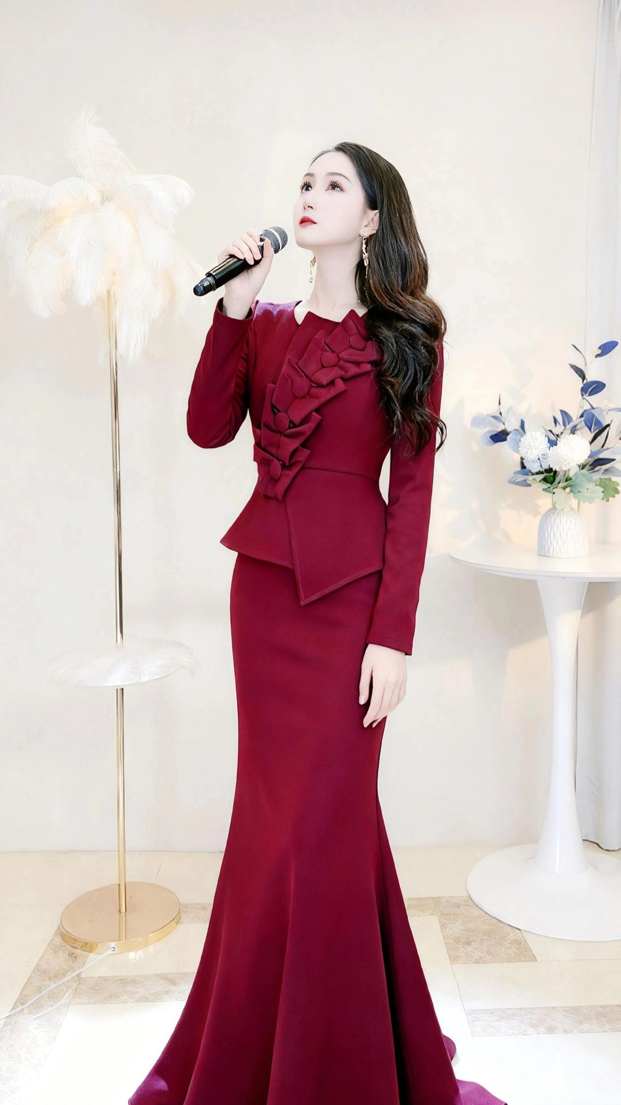 她立于聚光灯的中心,酒红色的鱼尾裙如凝固的浪涛,在脚踝处漾开温柔的褶皱。那衣身的立体花饰是暗夜里绽出的红玫瑰,随她抬手的弧度轻颤,像将未说的情绪都缝进了针脚里。 麦克风的金属冷光,撞在她眼尾的笑意上,碎成星星落进裙摆。背景里的金色纸屑在暗场中飘成缓落的星,或舞台穹顶的水晶灯淌下暖光,都成了她身后的注脚——像一首没写完的诗,把「优雅」两个字,裁成了裙摆的弧度,又揉进她垂眸时的声线里。连空气都浸着丝绒般的质地,裹着她的身影,成了时光里最妥帖的那帧画面。 好身材好气质 红色连衣裙 优雅气质 女神范