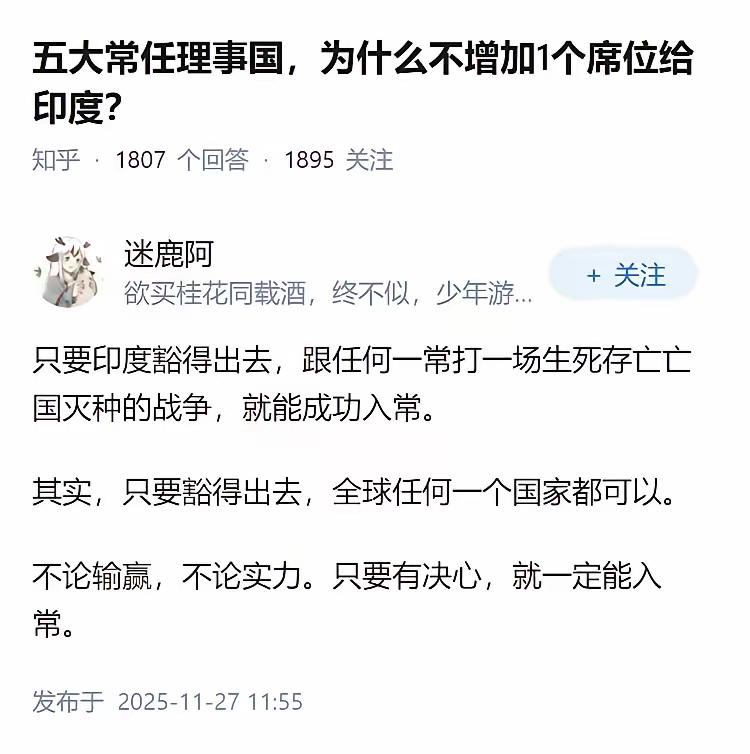 为什么要增加一个五常的席位给印度呢? 那给了印度,要不要给德国呢? 给了德国又要不要给日本呢? 巴基斯坦、朝鲜和以色列都有核武器,是不是比德国和日本更有资格成为联合国安理会的常任理事国呢? 土耳其作为连接欧亚的关键桥梁,战略地位尤其重要,是不是也应该给个常任理事国的席位呢?