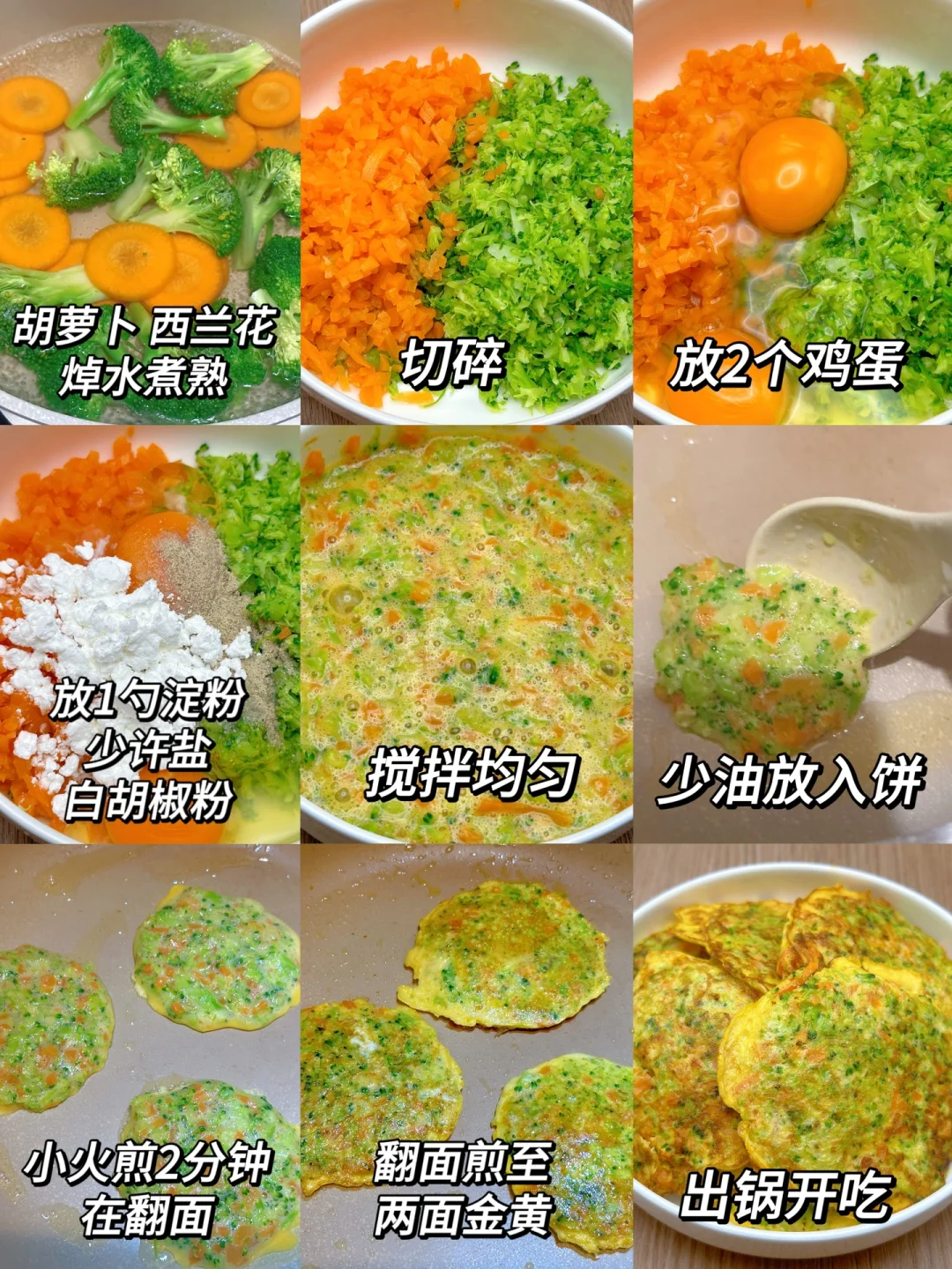 低卡胡萝卜西兰花鸡蛋饼真的泰香了,外焦里嫩,低卡低脂,浓郁的蛋香味,好吃又掉秤,饱腹还强,吃两三个有点饱了,一大盘也才200多大卡!一个饼才20大卡,两三个人才炫的完,[暗中观察R]减脂期的姐妹们可以放心吃~做法简单,赶紧试试吧~ [种草R]食材:鸡蛋、西兰花、胡萝卜(2~3人份) [种草R]做法:如图所示~(吃不完记得放冰箱哟) [斜眼R]更多的减脂餐在往期笔记~