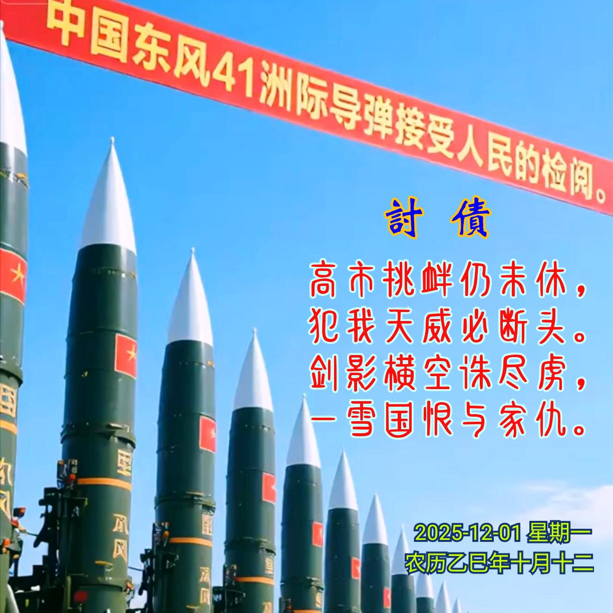 《讨债》 高市挑衅仍未休, 犯我天威必断头。 剑影横空诛尽虏, 一雪国恨与家仇。