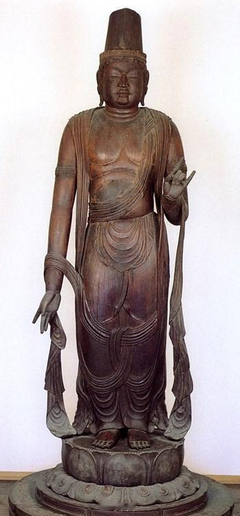 【常涤非超话】日本佛像 No.33 之京都常念寺 / 菩萨立像(年代:平安时代)原供奉于宿园神社的本殿药师堂。立像高169厘米,由一整块楝木制成,为朴素的木造立像。右脚呈悠闲姿态。披于双肩和双臂的天衣,在膝盖前交缠交织。日本佛像