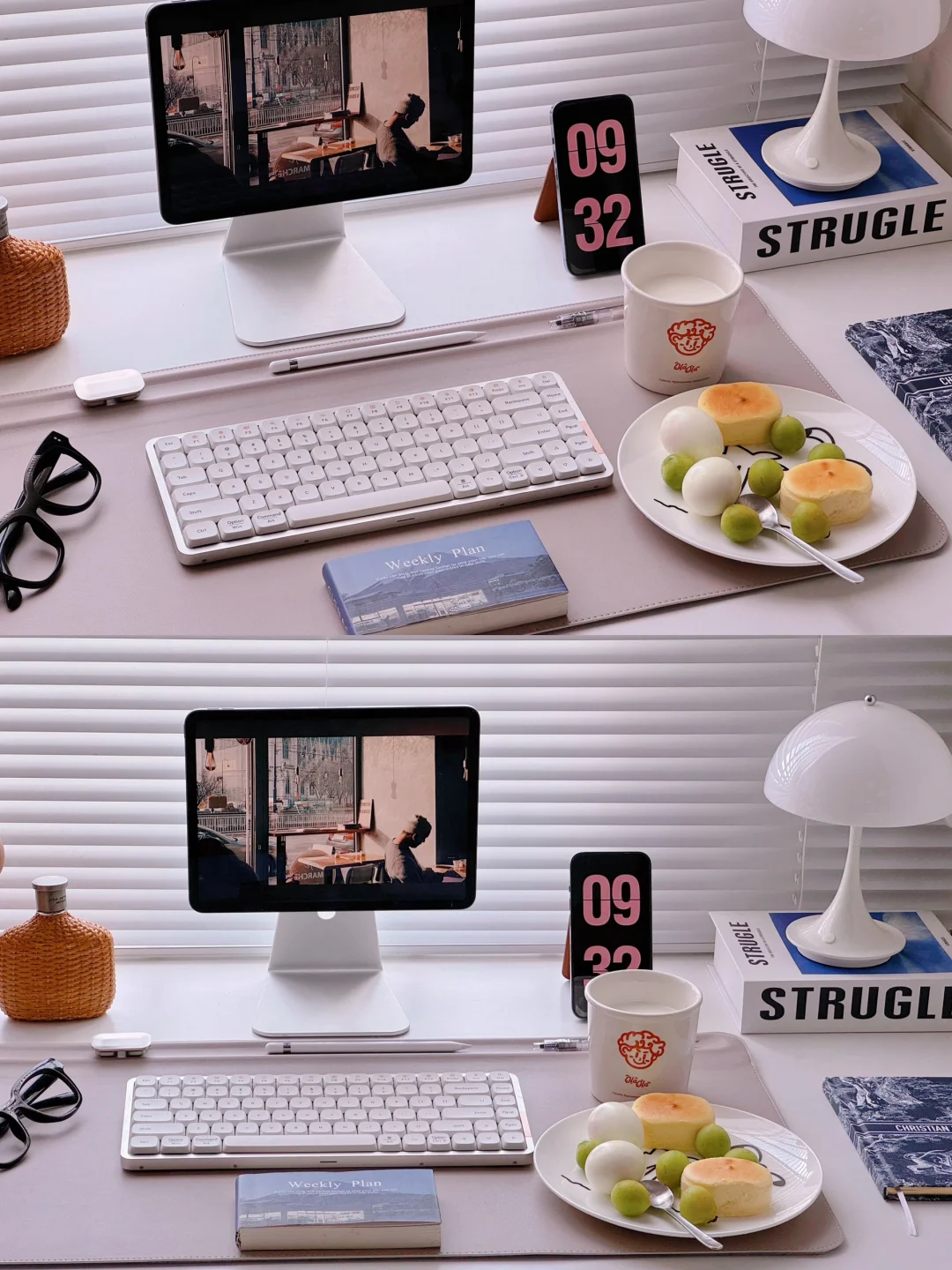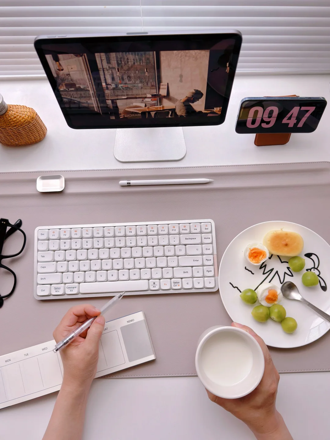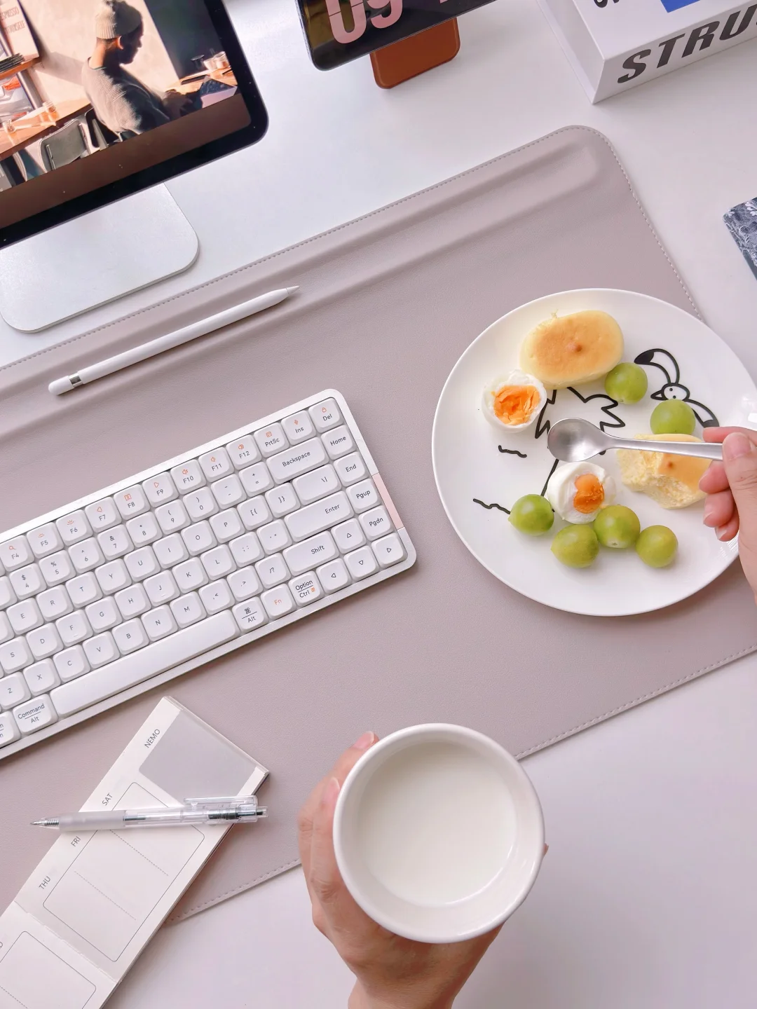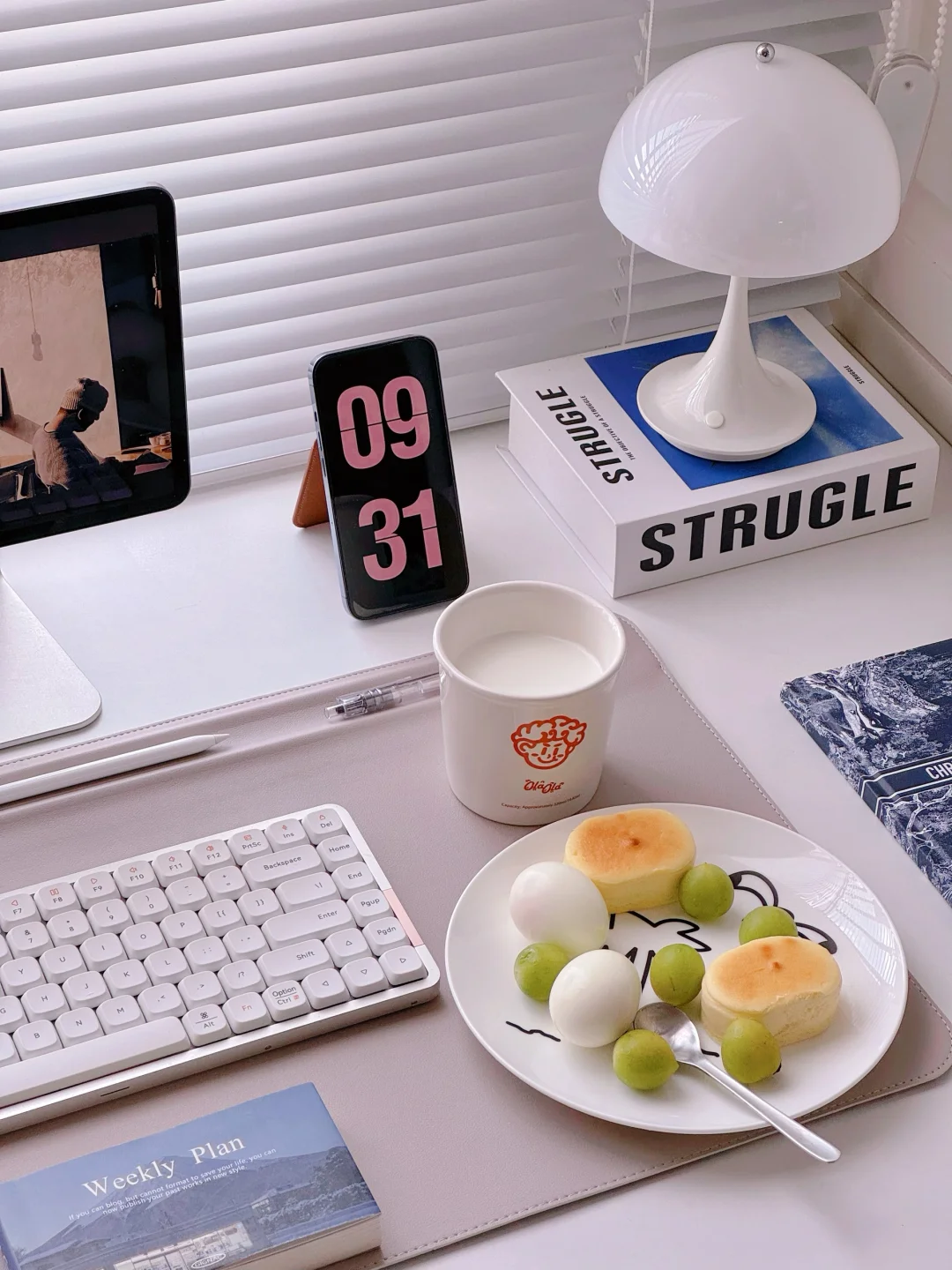 今日份书桌日常 打工人的早餐🍽️ 水煮蛋🥚+芝士蛋糕🧀+牛奶🥛+水果🥗
