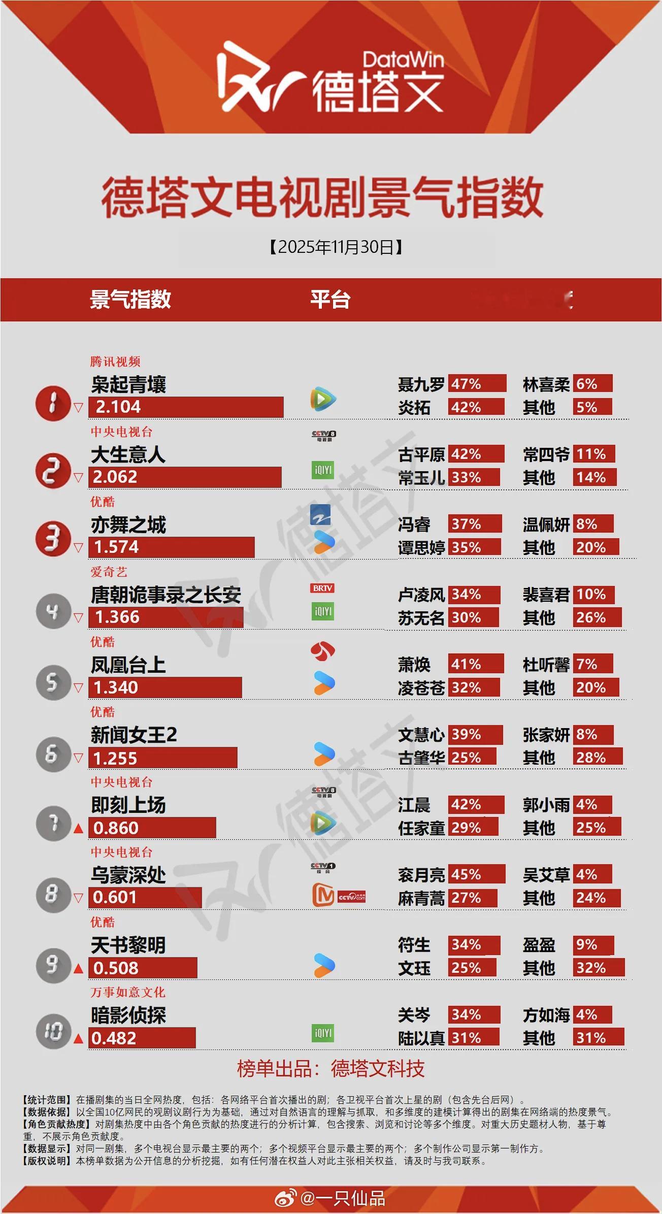 今日德塔文在播剧景气指数榜迪丽热巴《枭起青壤》依旧登顶TOP1真正优秀好剧集是大家都发自内心喜欢的。真的很棒枭起青壤迪丽热巴聂九罗 迪丽热巴枭起青壤
