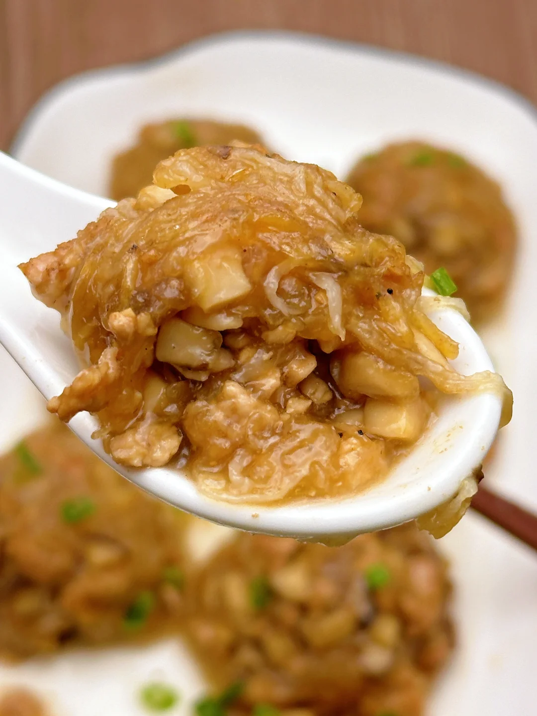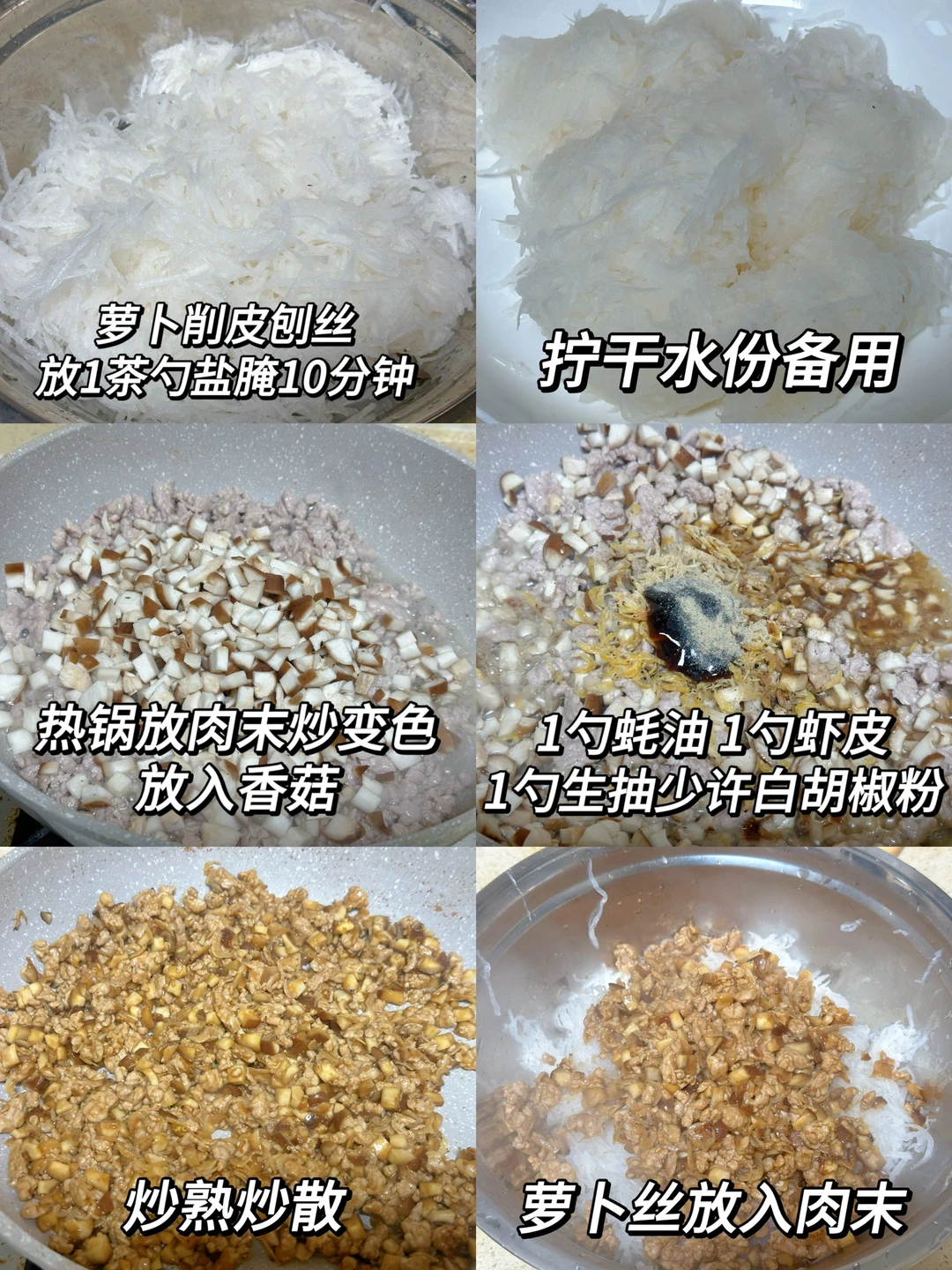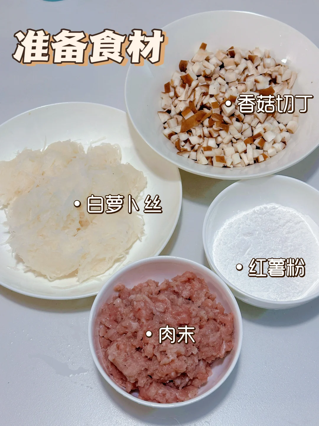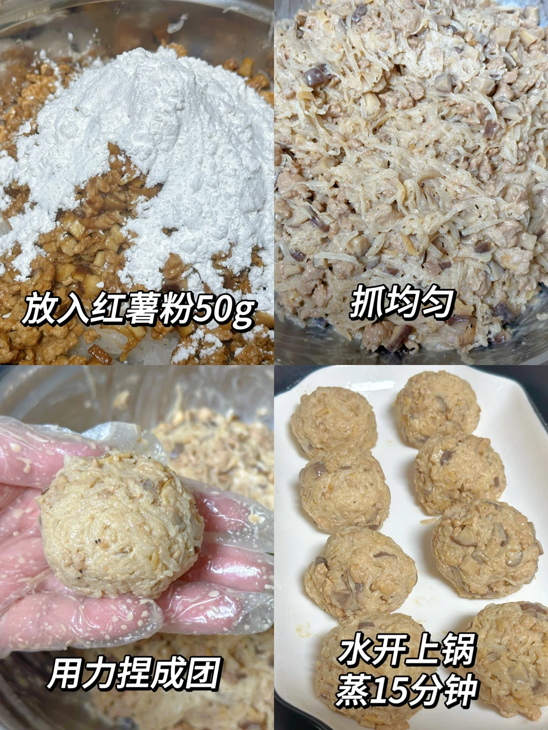 4️⃣炒好的馅料放入萝卜中,再加入一大勺木薯淀粉,抓拌均匀。搓成丸子,上锅蒸15分钟即可