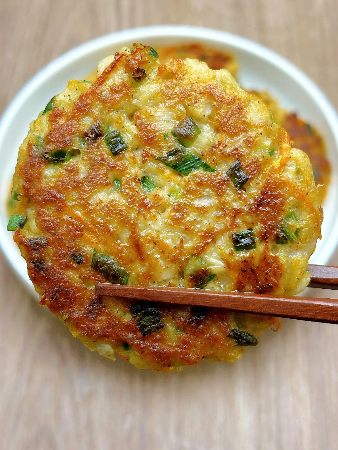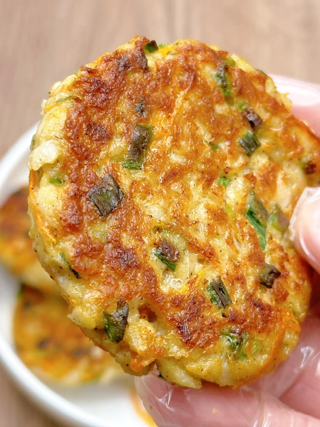 2️⃣取面糊摊成小饼,放热油锅里,最小火煎至两面金黄即可(第一面要煎久一点再翻面,不然容易碎)