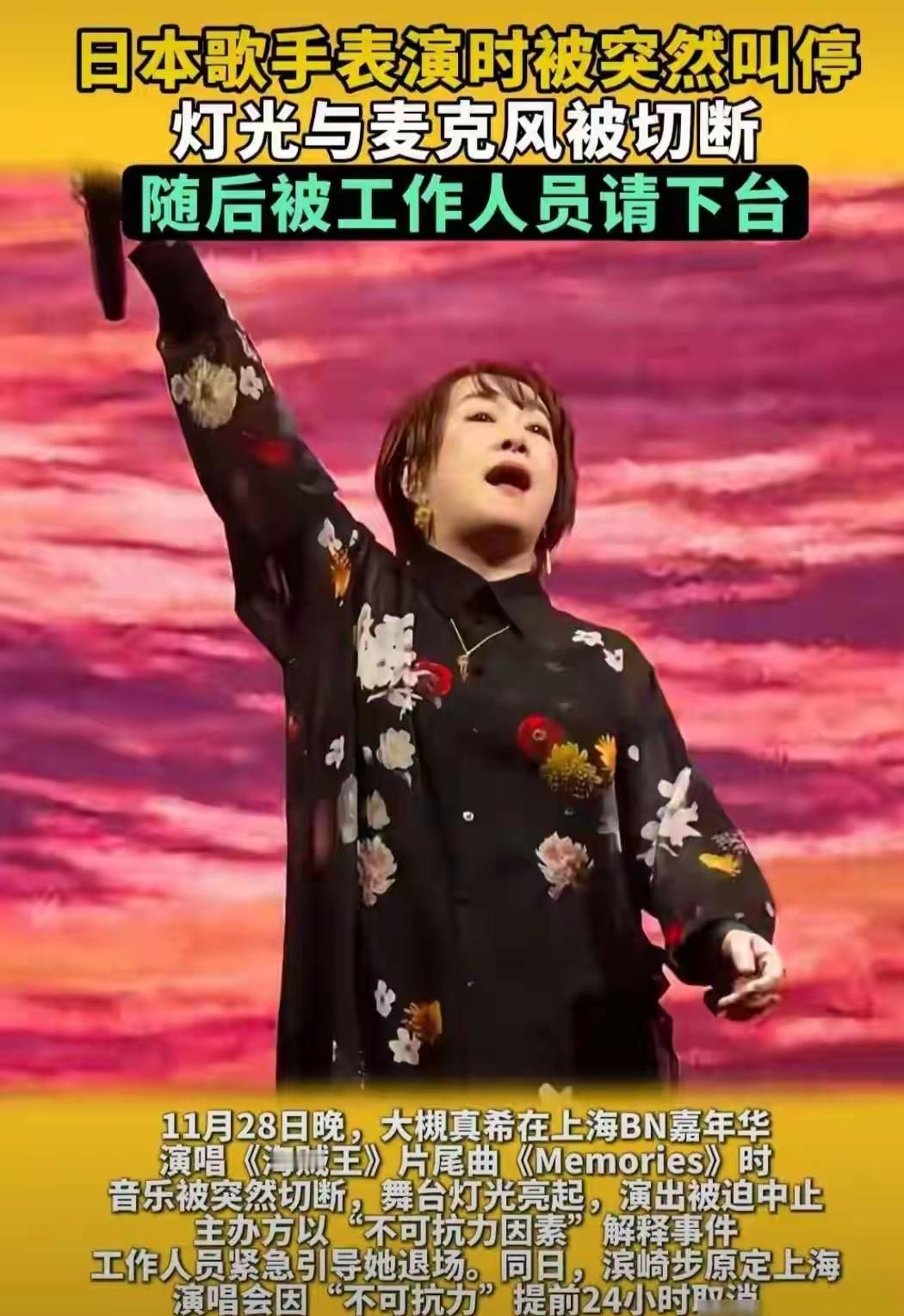 中国已层层加码,日本继续嘴硬就真准备打了,断绝文化交流也是一环,估计是有人违规批了演唱会,开演后被人捅上去了,直接中途就被干了。