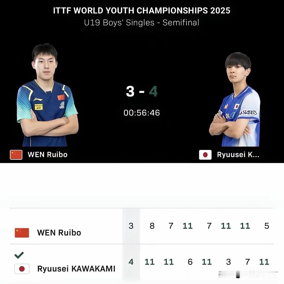乒乓球世青赛结束U19男单半决赛,国乒18岁的希望之星、刚刚在全运会拿到青年组男单冠军的温瑞博不敌刚刚升组的日本队16岁小将川上流星,无缘决赛,川上流星与队友吉山和希会师男单决赛,后者4-1击败另一位中国小将李和宸,日本队也提前包揽了冠亚军。温瑞博作为国乒重点培养的新生代佼佼者,本次比赛身兼四项,没有拿到一个冠军,包括团体赛输两分直接让中国队丢冠,表现有点让人失望。