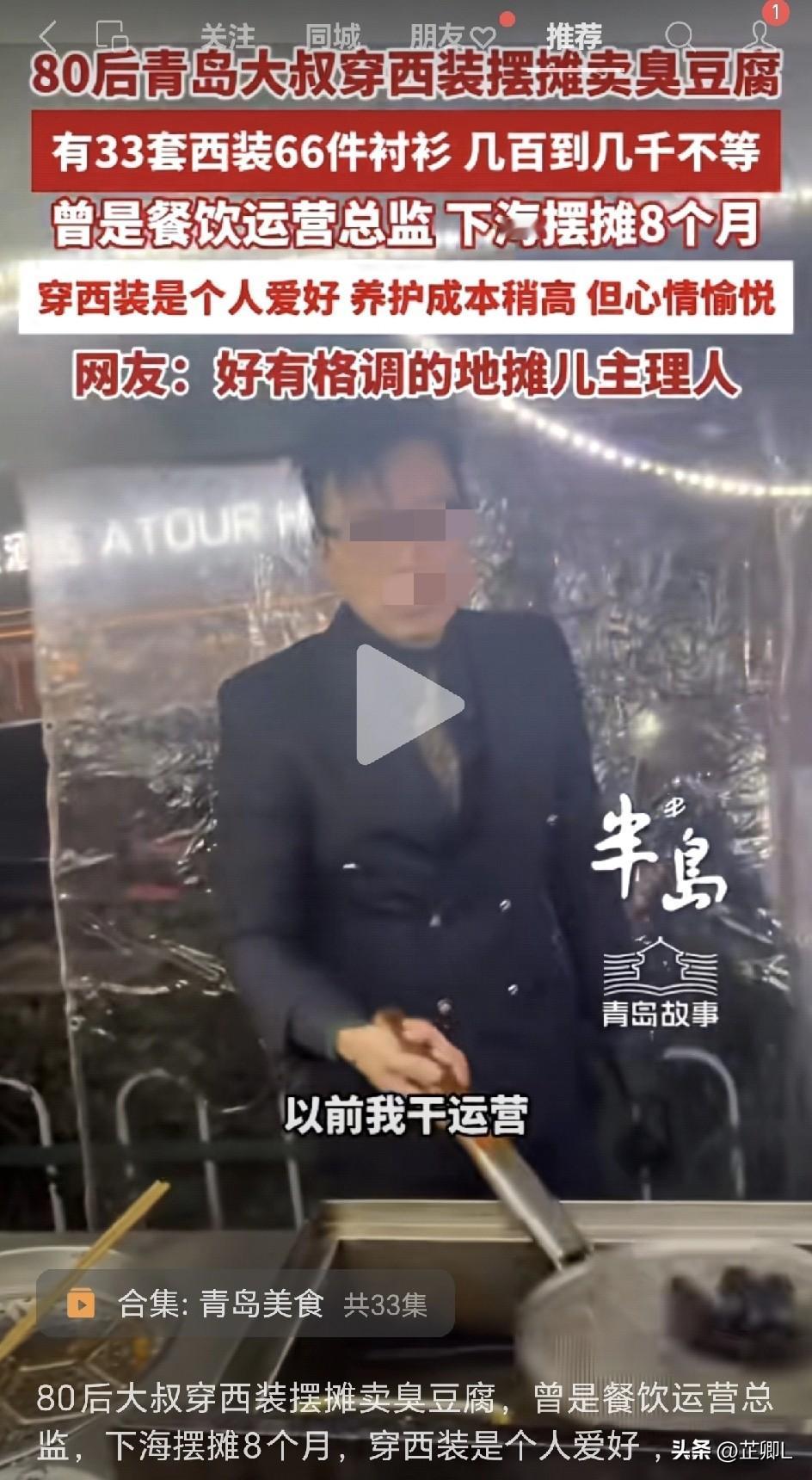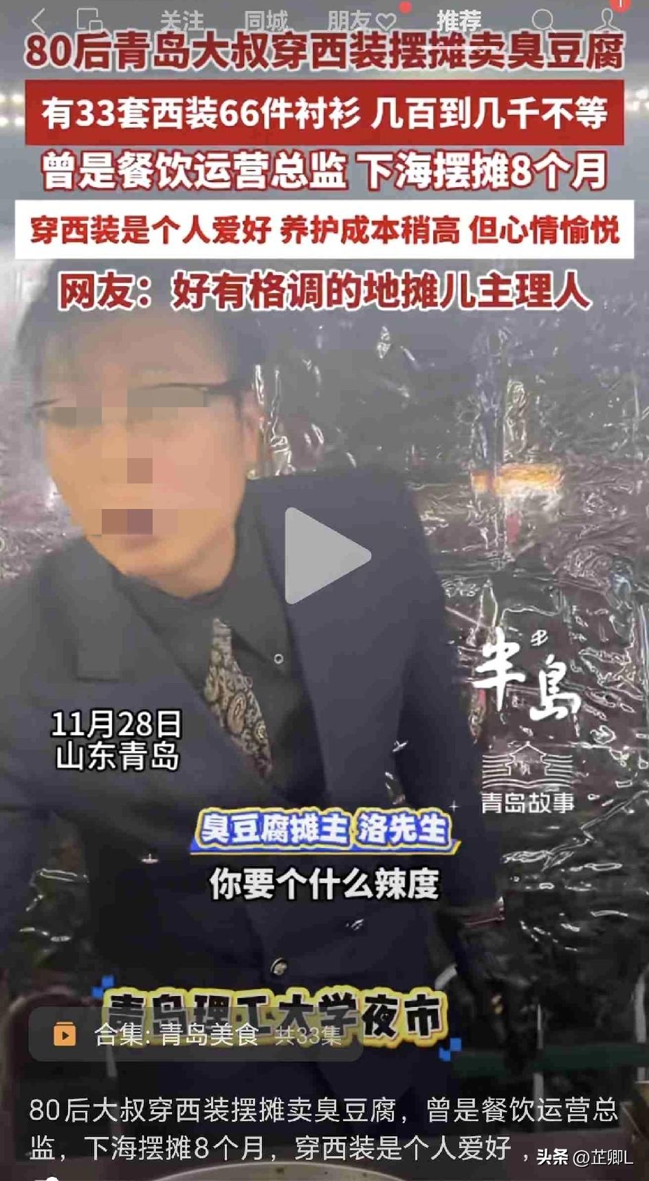 青岛夜市“西装大叔”火出圈:前运营总监炸臭豆腐,生活仪式感拉满! 近日,山东青岛,在青岛理工大学夜市,有一位穿着西装炸臭豆腐的80后大叔火出圈,身着笔挺西装、优雅炸着臭豆腐。 这位大叔用自己的行动诠释着:生活无处不舞台,仪式感是对自己与顾客的双重尊重。 这位80后的大叔,洛先生,曾经是餐饮行业的运营总监,原来工作中穿西装的场合多,家里有33套西装,配66件衬衫,价格从几百到几千不等。 再加上洛先生个人也喜欢穿西装,西装一上身显着人身姿挺拔,倍有精神。 所以,即便“下海”摆摊,从洛总到这个臭豆腐洛摊主,他依然保持着穿西装的习惯。 洛先生说,生活要有仪式感,每天穿的干干净净、漂漂亮亮的,让顾客看到,也会心情好好,干净体面是对顾客的尊重。 不过,洛先生也自嘲,就是西装的养护成本有点高。 做臭豆腐,是要油炸的呀,洛先生不围围裙,少不了会被油溅到衣服上,油点子确实不好清理。 网友们纷纷赞叹洛先生是一位好有格调的地摊儿主理人! “霸道总裁改行卖臭豆腐!” “我也一样!每天花枝招展去摆摊。” “穿着干净得体 顾客吃着放心!” “吃过 他的摊儿 不错的!” “感觉像董事长给人做好吃的一样。” “运营高手,懂流量的。” “我一个精致朋友 俩娃宝妈 也刚开始摆摊卖早餐了 以前曾经年入百万 。” “不愧是干过运营,干净整洁利落干净!” “有格调的摊主,这就叫吃的艺术性。” “俺们青岛人就是干净利落,浪哩个浪……” 也有很多网友纷纷说,自己去吃过他的摊儿,很不错。 也有提出批评声音的,就是建议大叔带上口罩,可以是那种透明的不耽误说话,也不影响帅的。 无疑,他是懂流量和生活的,他日复一日地,用最精致的样子,经营着最接地气的生意。 这样的博流量,我觉着可以有! 洛先生的故事,不仅仅是一个关于转型或创业的故事,更是一个关于如何在平凡生活中坚守热爱、保持体面的生动范本。 他向大众证明了,无论身处何种岗位,认真对待自己、尊重生活的人,总能闪闪发光。 信息来源于半岛e游,侵联删! 带定位晒今日生活 我的今日状态:🏃➡️运动 我这里的天气:☀️晴天