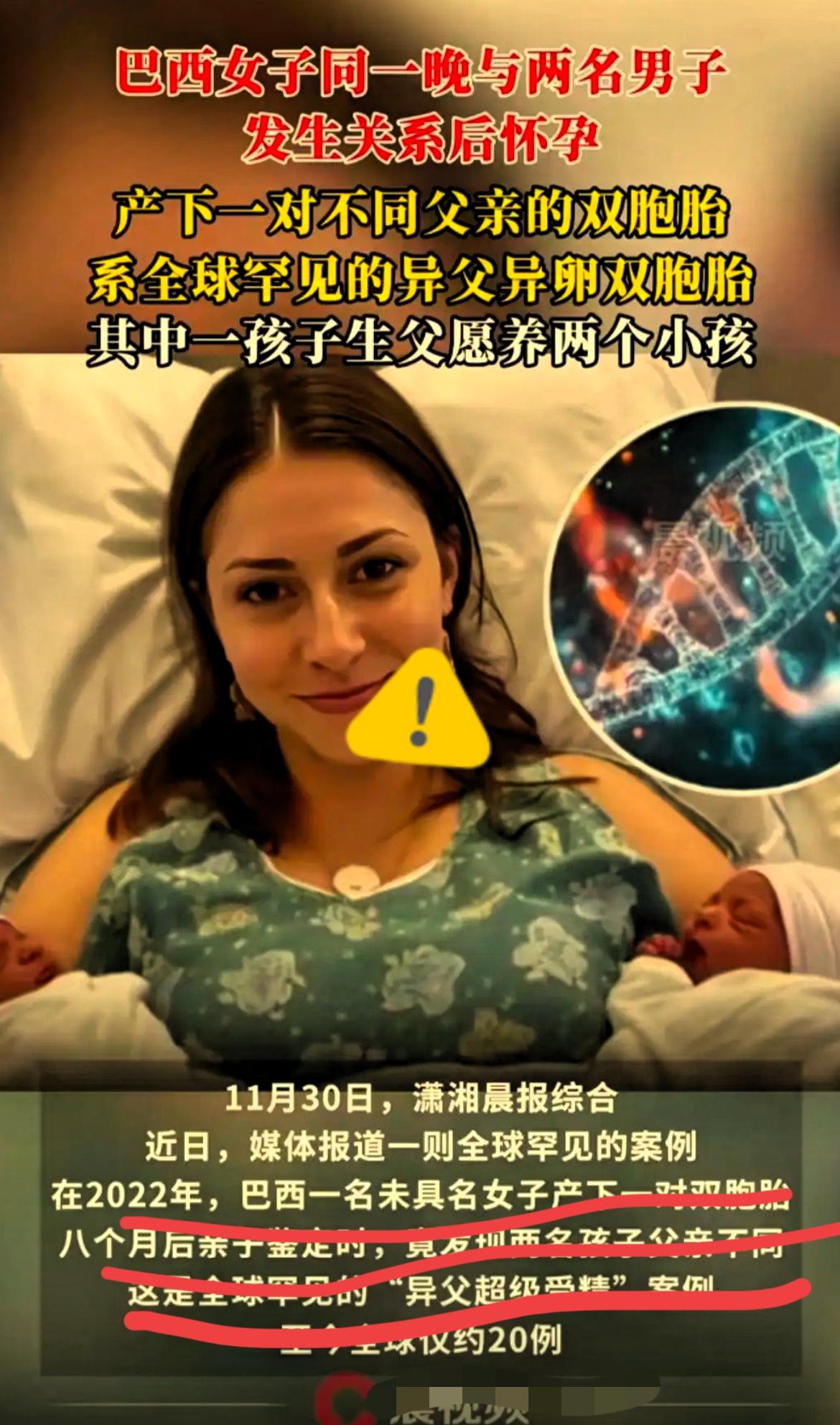 你敢信?巴西一女子同一晚和俩男子发生关系后怀孕,生下双胞胎,8个月后亲子鉴定,居然俩孩子生父不同,这就是全球罕见的异父同母双胞胎。 这种情况是因为女性一次排卵期排出多颗卵子,短时间内和不同男性受精,或者短时间两次排卵分别受精。孩子共享母亲基因,在不同胎盘成长。 这案例全球也就约20例,之前土耳其、美国、巴西都出现过。咱说,这事儿对家庭冲击可不小,像2018年巴西那对夫妻就因这离了婚。这次其中一个孩子生父愿养俩小孩,也算是一种安慰。大家咋看这种事儿呢,评论区聊聊呗。