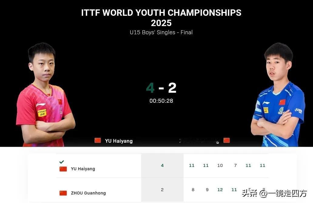 乒乓球世青赛U15男单决赛,于海洋4-2战胜队友周冠宏,五轮比赛只丢三局,斩获冠军,中国队包揽冠亚军,可惜在U19男单半决赛,两位中国球员温瑞博和李和宸都负于日本球员,无缘决赛。