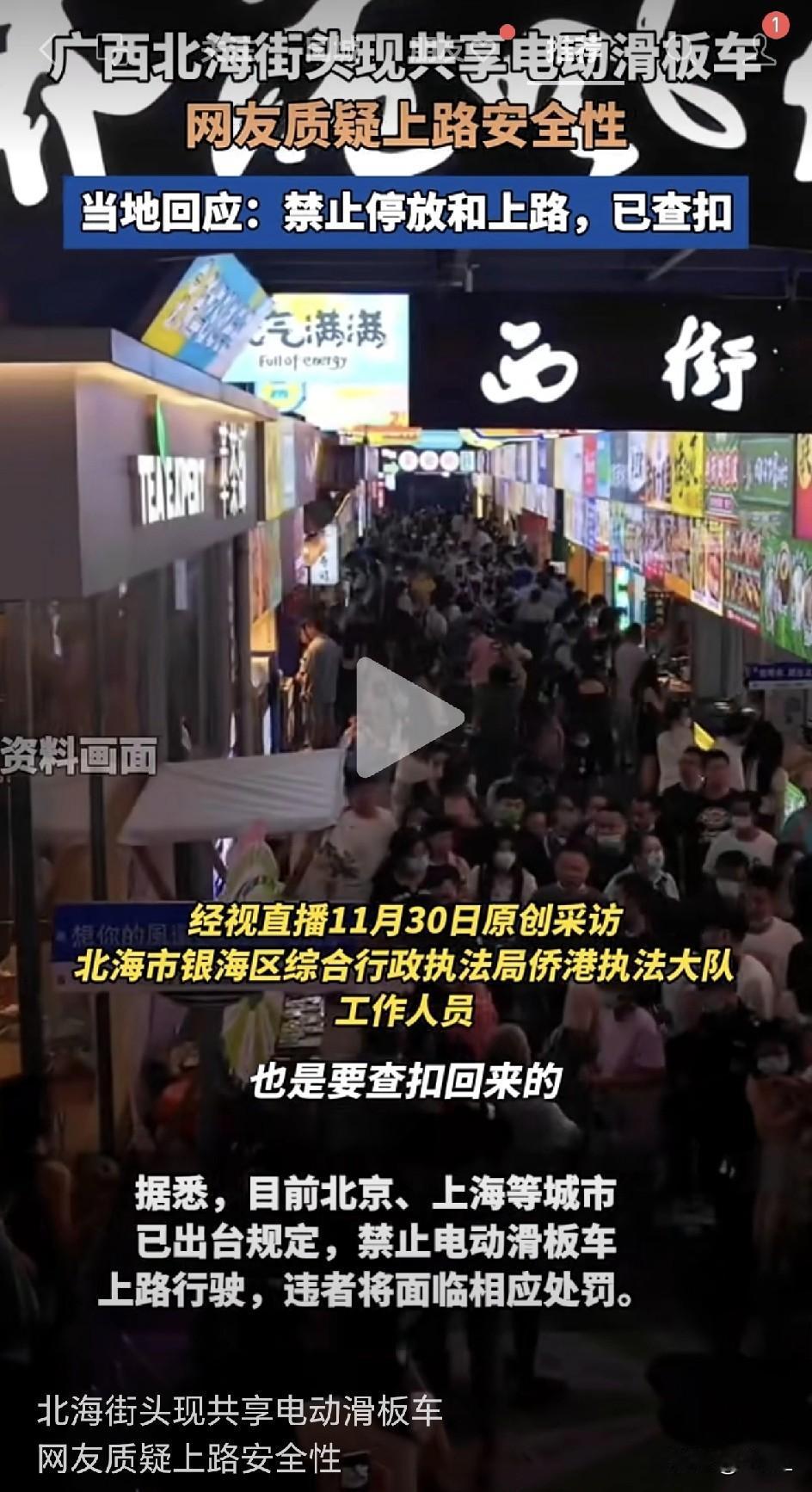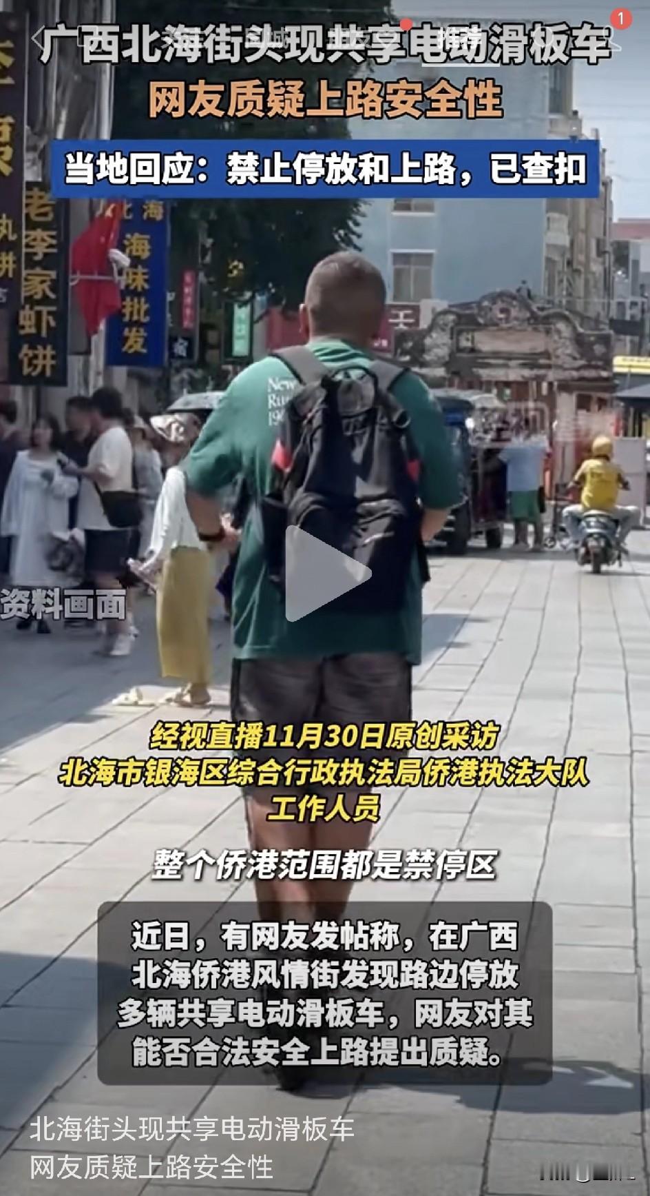 马路新杀手?电动滑板车不戴盔穿行车流,网友:看着都捏把汗!北海已出手查扣!其实,电动滑板车在多地都是禁行工具! 近日,有网友发帖称,在广西北海侨港风情街,发现路边停放多辆共享电动滑板车引起了网络热议。 11月30日,据当地相关部门回应,该区域禁止此类车辆投放与使用,执法人员已前往现场核查,发现只有一辆,已经对违规车辆进行查扣。 据说,这个区域,道路狭窄、人流密集、交通拥堵,为了安全起见,连共享电动车也是禁止停放的。电动滑板车,稳定性和防护性要弱的多,是绝对不允许上路的。 其实不少城市,比如北京、上海,对于电动滑板车、平衡车、独轮车等都是禁止上路的,上路也面临着器械扣留和罚款。 第一次见这种电动滑板车,是当初送儿子上大学时,在校园里看到的,只能在校园里骑行,不能出门。 现在偶尔也会在马路上看到有人骑电动滑板车、平衡车或者独轮车,在人群或者道路上穿行。 作为一个旁观者,目睹他们在车流人群中灵活穿梭,心中不免捏一把汗——尤其是,几乎看不到有使用者佩戴头盔。 这些新兴的“微出行”工具确确实实为短途交通提供了便利,但它们所带来的安全问题、路权争议以及管理挑战也同样不容忽视。 就像之前没有规划的电动自行车的问题,还在不停的调研和调整之中,现在又出现了电动滑板车、平衡车、独轮车。 如何在鼓励创新、满足公众出行需求与守护城市交通安全底线之间找到一个平衡点,是管理者、运营方和使用者都需要共同面对的课题。 但是,有一点毋庸置疑,城市的街道是所有人的共享空间,每一份便利都不应以安全为代价。 信息来源于经视直播,侵联删!