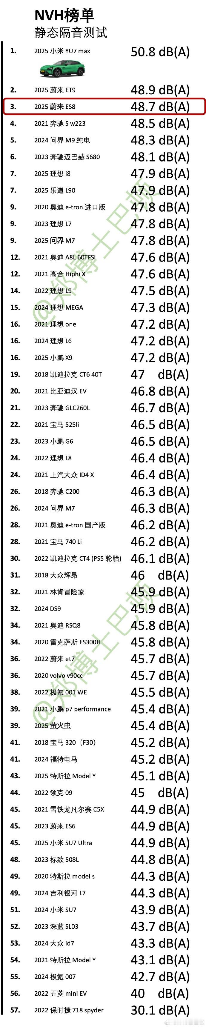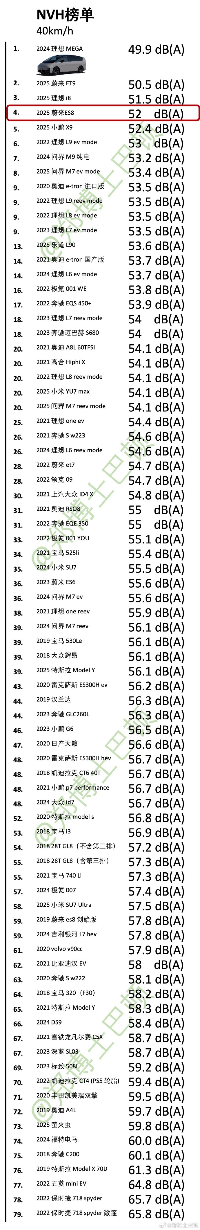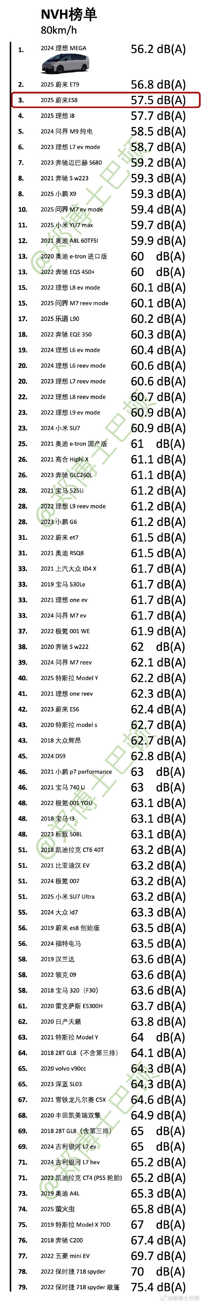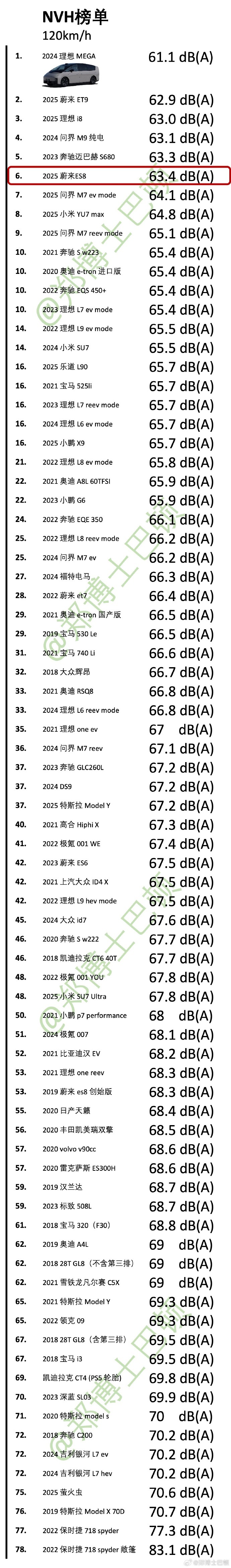 数据来源于,ES8 的 NVH 水平排名,毫无疑问,是一个非常强的水平,无论是静态还是动态静态体现的是隔音水平,考验的是用料动态会把风噪、胎噪纳入考量,ES8 属于传统的方正的 SUV,在这个造型下,有这个水准,没啥可说的了蔚来全新es8蔚来