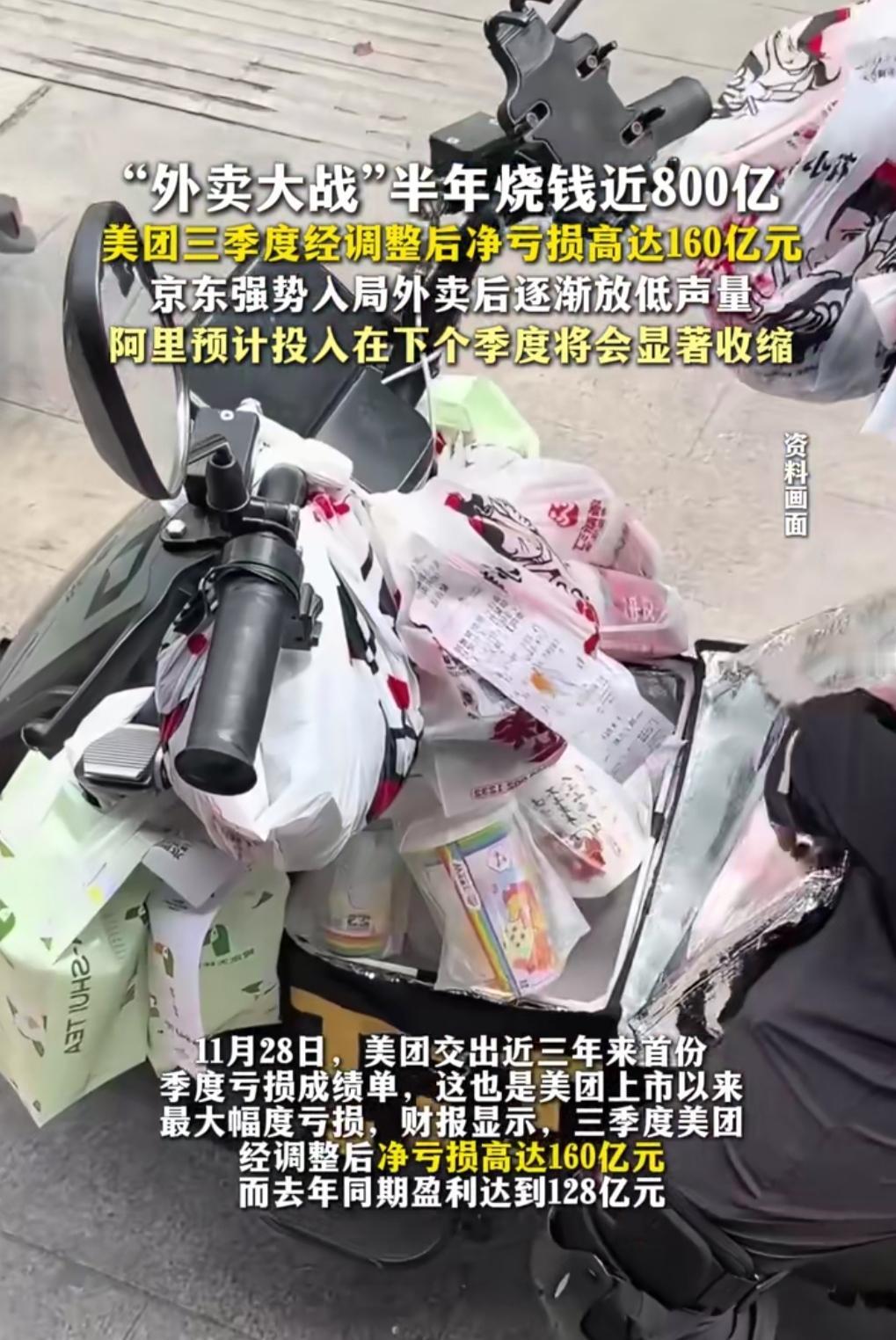 没想到每天点的外卖,背后藏着一场烧钱烧到离谱的大战。半年800亿砸进去,巨头们亏得底朝天,可咱们点外卖的钱,好像并没少花。 最近美团三季度净亏160亿,京东外卖没了声响,阿里也准备收缩投入。这场打了好几年的仗,拼的从来不是谁的饭好吃、配送快。 资本砸钱抢用户,商家被抽佣压得喘不过气,骑手顶着超时罚款狂奔,咱们看似捡了优惠券的便宜,最后要么羊毛出在羊身上,要么服务悄悄缩水。 外卖的本质该是方便生活,不是资本博弈的棋盘。当烧钱的泡沫破裂,或许留下的只会是疲惫的商家、辛苦的骑手和回归理性的普通人。