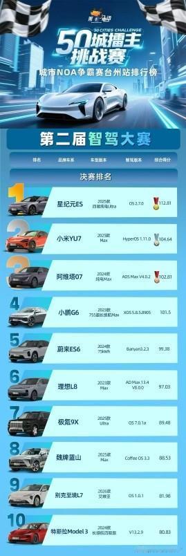 星纪元 ES 荣获第二届智驾赛决赛第一,这成绩让不少人惊讶。看看这排名,它综合得分 112.81,把第二名小米 YU7 Max 的 104.64 都拉开了差距,更别说第十名特斯拉 Model 3 的 80.93 分了,理想 L8 也才 97.03 分。 这次比赛线路全长 35 公里,有 43 个红绿灯、5 个途经点、6 大考点,难度不小。采用“闭卷考试”,覆盖社区窄路、乡村道路等多元场景,窄路会车博弈与动态障碍物避让很考验智驾能力。星纪元 ES 全程 0 接管夺冠,实力可见一斑,说它“遥遥领先”也不为过。