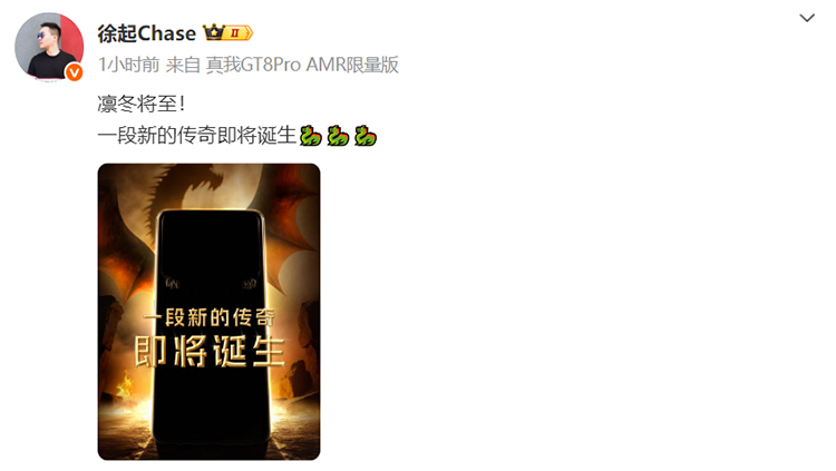 今天,真我realme副总裁、全球营销总裁、中国区总裁徐起在微博曝光了一款realme新机,同时配文“凛冬将至!一段新的传奇即将诞生。”这个设定,看起来很容易让人想到《权力的游戏》,实际上,之前realme在海外市场发布过realme 15 Pro权游限定版手机,暂时不确定这次国行版本,是与海外版保持一致~
