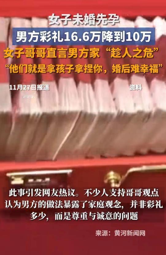 山东,女子即将和男友订婚,双方商定好16.6万彩礼,可谁知,男方得知女子未婚先孕后,突然把彩礼降到10万,丝毫没有商量的余地。看到男方家这么不讲诚信,女子的哥哥为她打抱不平,觉得男方就是趁人之危,用孩子来拿捏他妹妹,这样的婚姻根本谈不上幸福可言。一边是肚子里的孩子,一边是婚姻幸福,女子陷入两难的境地,不知所措。 在山东,订婚谈彩礼本是件图吉利、眼看到了谈婚论嫁的地步,两边家长特意约了顿饭,把彩礼的事儿敲定了,16.6万,寓意着“一路顺”,不管是小李家还是男方家,当时都点头同意,没半句异议。那时候小李心里别提多踏实了,每天都琢磨着,等彩礼到手,给爸妈买点营养品,再添点家具家电,把未来的小家布置得温馨点,日子就能顺顺当当过起来。 可谁能想到,一盆冷水偏偏在这时候浇了下来。小李意外发现自己怀孕了,满心欢喜地把这个好消息告诉男友,男友一开始也挺兴奋,抱着她转了好几个圈,嘴里不停念叨着“要当爸爸了”。可这份喜悦没持续多久,等男友把怀孕的事儿告诉家里,再回头跟小李谈彩礼时,态度就彻底变了。 男方家直接抛出话来:彩礼只能给10万,多一分都没有。小李当场就懵了,追问缘由,对方只说家里手头紧,还理直气壮地说“都怀了咱们家的孩子了,就是一家人了,还计较这几万块钱干啥?” 那语气里没有半点商量的余地,仿佛之前谈好的16.6万压根就是随口说说,不算数。 小李心里又气又寒,她在意的从来不是少了这6万6,而是这前后态度的巨大反差。这哪里是家里真没钱,分明是觉得她怀了孕,就没法轻易退婚,所以才敢这么明目张胆地压价,把她的软肋当成了讨价还价的筹码。 她把这事跟家里一说,哥哥当场就炸了,气得直发抖,直言男方家这是典型的趁人之危。 哥哥找上门去,没敢说重话,但句句都戳在点子上。 他说,婚前就把话说得明明白白,现在仗着妹妹怀了孩子就变卦,这不是诚信不诚信的问题,是压根没把妹妹放在眼里,没把这门婚事放在心上。哥哥还说,这还没进门就开始这么算计,用孩子来拿捏人,真要是嫁过去了,以后在婆家能有什么地位?受了委屈谁能替她撑腰?这样的婚姻,根本谈不上什么幸福可言。 周围的亲戚朋友知道了这事,也都替小李抱不平。有人说男方家太不地道,没点担当;也有人劝小李慎重,婚前就这么不讲信用,婚后日子大概率不会顺心。可小李现在真的犯了难,夜里翻来覆去睡不着,看着自己还不明显的小腹,眼泪就忍不住往下掉。 她不是贪财的人,要是男方家真有难处,好好跟她商量,哪怕少个一万两万,她也能理解,甚至愿意体谅。可男方家这种做法,明摆着就是觉得她“跑不了”了,才敢这么硬气地改彩礼,连句像样的解释都没有。 更让她寒心的是,曾经对她百般体贴的男友,在这件事上全程沉默,既不替她说话,也不跟家里据理力争,只是一个劲地劝她“别闹僵了,都是一家人”。 一边是肚子里的小生命,那是她和男友的孩子,她舍不得放弃;可另一边,男方家这种不讲诚信、趁人之危的态度,又让她心里发慌。 她真的不敢想,要是就这么妥协嫁过去,以后婆家会不会变本加厉地拿捏她?自己在这个家里,还能有尊严吗?万一以后受了委屈,男友会不会还是像现在这样,一味地让她妥协退让? 现在的小李,每天都活在纠结和痛苦里。亲戚们有的劝她再跟男方好好谈谈,让他们拿出点诚意;也有的劝她别委屈自己,要是男方家一直这个态度,就算结了婚也不会幸福。 可她真的不知道该怎么办了,往前走,是让人寒心的算计;往后退,是舍不得的孩子和两年多的感情。 好好的一场婚事,本该是皆大欢喜的结局,却因为这突如其来的彩礼缩水,变得一地鸡毛。 小李只盼着男方家能有点诚意,别再拿孩子当筹码,可看着对方强硬的态度,她又忍不住心灰意冷。这道选择题,太难选了,选哪条路,似乎都要承受难以承受的代价,也难怪她会这么不知所措。 信源:小鱼视频2025-11-28——女子未婚先孕,男方彩礼16.6万降到10万,女子哥哥直言男方家“趁人之危