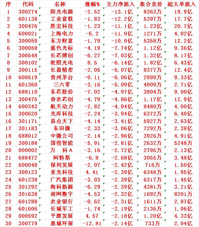 12月1日尾盘30分钟,主力资金大幅卖出的30名单! 阳光电源:净流入 -13.1亿元,集合竞价成交 8363万元 工业富联:净流入 -12.2亿元,集合竞价成交 5397万元 胜宏科技:净流入 -11.1亿元,集合竞价成交 1.23亿元 上海电力:净流入 -11.0亿元,集合竞价成交 1271万元 东方财富:净流入 -10.0亿元,集合竞价成交 5358万元