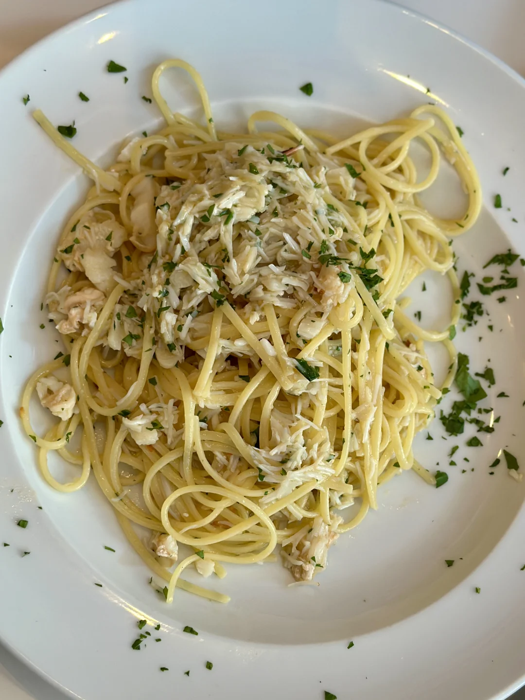 炒蟹肉,大蒜,辣椒,欧芹,意大利面。鲜美蟹肉,入口先是鲜甜,再是辣椒的微微kick,融合大蒜和欧芹的香。这道真的,爱!